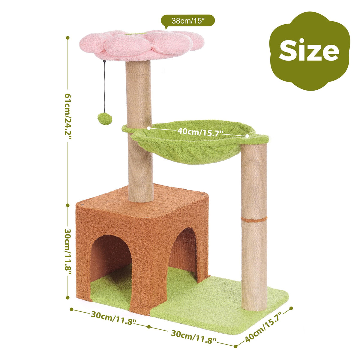 Introducing Pink Flower Cat Tree Cute, A Charming And Functional Cat Necessary To Any Home, Perfect For Both Kittens And Adult Cats. This Small Cat Tower With A Scratching Post Is Designed To Resemble A Vibrant Flower Plant, Complete With A Sturdy Branch-Like Post And Lush Leaf-Like Hammock. Its Compact Design Makes It Ideal For Small Spaces While Still Offering Ample Room For Your Feline Friends To Play And Relax. Key Features: Charming Floral Design: The Cat Flower Tree Features A Delightful Pink Flower Motif, Bringing A Touch Of Nature Indoors. Its A Cute Cat Tree That Adds Aesthetic Appeal To Home Decor. Spacious For Large Cats: The Large Metal Frame Hammock Measures 15.7', Offering A Cozy And Stable Spot For Your Cat To Rest. The Roomy Condo, Sized At 15.7' X 11.8' X 11.8', Is Perfect For Both Small And Large Cats, Ensuring They Have Plenty Of Space To Nap. Sturdy Structure And Stability: Built From High-Quality Boards And Covered In Soft Plush, This Cat Tree House Ensures Comfort And Durability. The Expanding Base (23.6' X 15.7') And Reinforced Anti-Tip Straps Provide 100% Stability, Making It A Safe Playground For Your Cats. Perfect For Scratching Needs: The Fully Wrapped 32-Inch Natural Sisal Scratching Post Offers A Complete Vertical Scratching Experience, Catering To Cats Of All Sizes. The Detachable Dangling Ball Keeps Your Cat Entertained And Can Be Easily Replaced. Easy Assembly And Excellent Service: This Kitten Tower Comes With A Detailed Instruction Manual And All Hardware For Quick And Hassle-Free Setup. Our Excellent Customer Service Is Always Ready To Assist You, Ensuring Your Satisfaction With The Purchase. This Compact Cat Tree Is Perfect For Indoor Cats, Offering A Playful Yet Relaxing Environment. Whether Youre A New Kitten Owner Or A Seasoned Cat Lover, This Small Cat Tower With A Hammock Is An Ideal Choice For Your Furry Friends. Enjoy The Vibrant Design And Functionality Of This Flower Cat Tree, Making It A Delightful Centerpiece In Your Home.