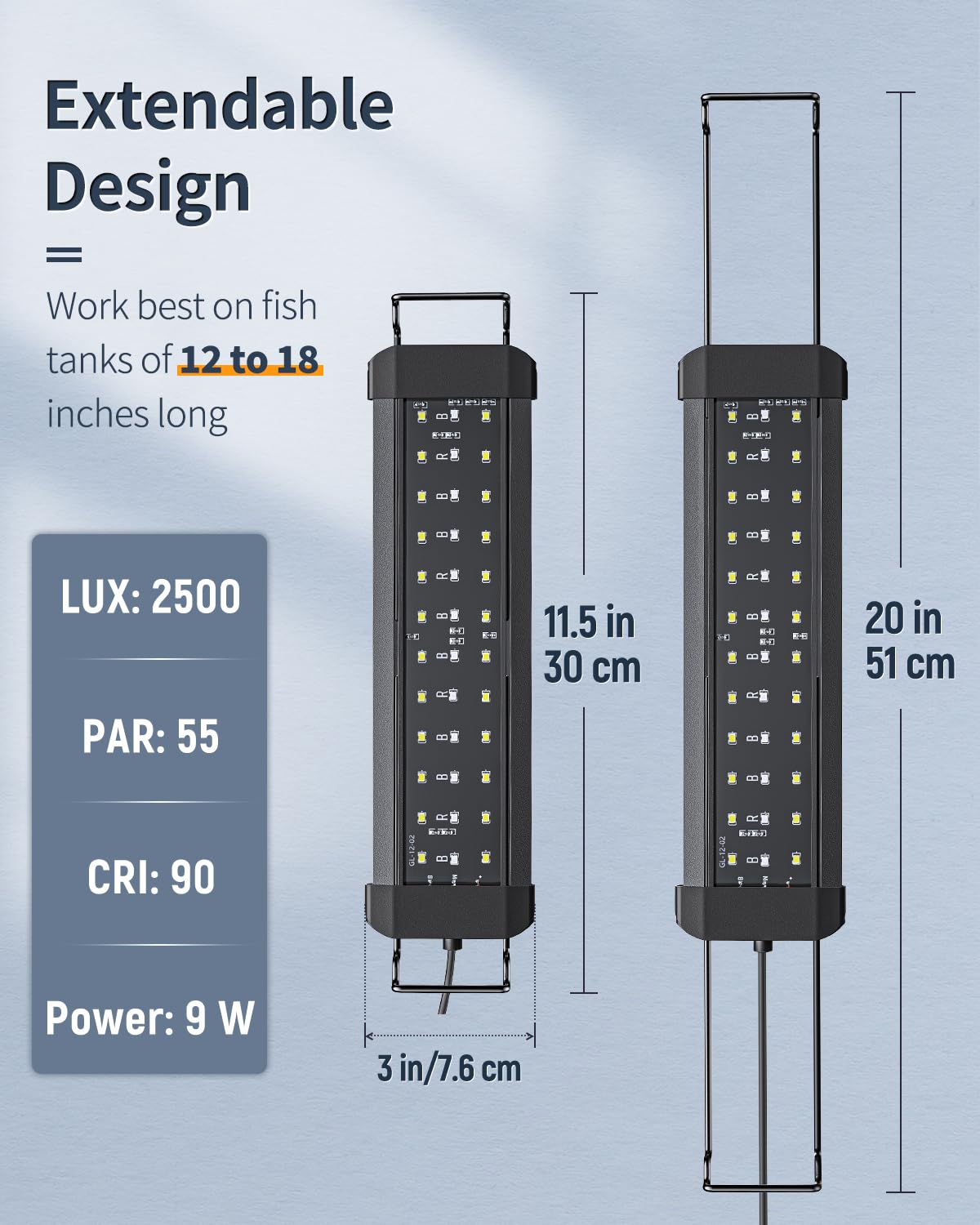 For 12'' to 18'' Tanks: With an extendable bracket (min length: up to 11.5''; max length: up to 20'') the LED aquarium light always stays steady on the fish tank. Work best on tanks of 12 to 18 inches long.