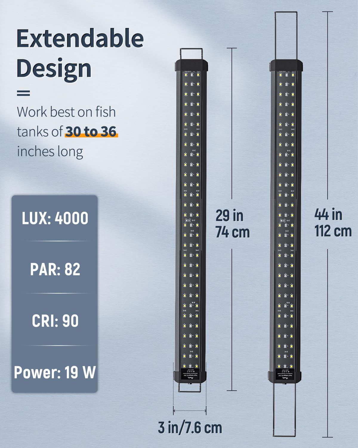 For 30'' to 36'' Tanks: With an extendable bracket (min length: up to 29''; max length: up to 44'') the LED aquarium light always stays steady on the fish tank. Work best on tanks of 30 to 36 inches long.