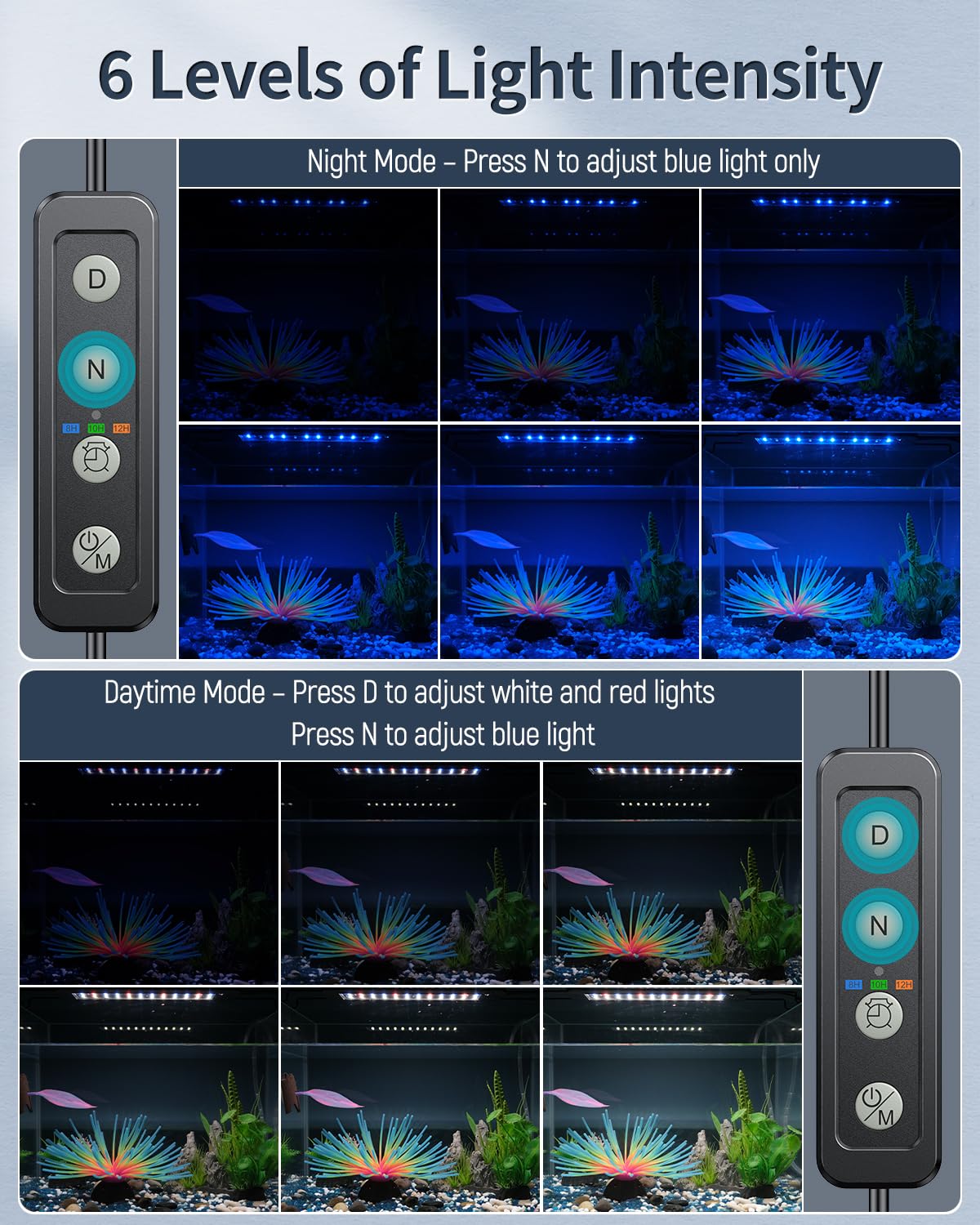 2 Lighting Modes: Short press the M button repeatedly on the fish tank light to switch between daytime and night modes. Hold the M button for 3 seconds to turn all lights off. Simulate natural sunrise and sunset to energize your fish and give them a sound sleep.