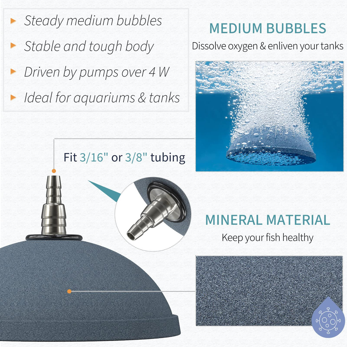 Medium Bubbles: The air stone produces abundant dense bubbles to aerate your water reservoirs A great way to increase oxygen solubility in fish tanks aquariums or ponds Model: ASR-100 Jetting volume: 15 Lmin Recommended air pump power: > 4 W Standard ID airline tubing: 316 or 38 great for aquariums DWc systems or ponds Reliable Material: Made of mineral material and sintered at a high temperature it causes no effect to the health of your aquatics Help keep fish or roots growing healthily No More Floating: Measures 4 D x 15 H and weighs 116 oz And its wide and flat bottom always keeps it sitting stably in the tank to produce steadier bubbles Easy to Use: Soak the stone completely in water for more than 3 hours before use clean it regularly with a brush as it gets clogged after weeks or months of usage