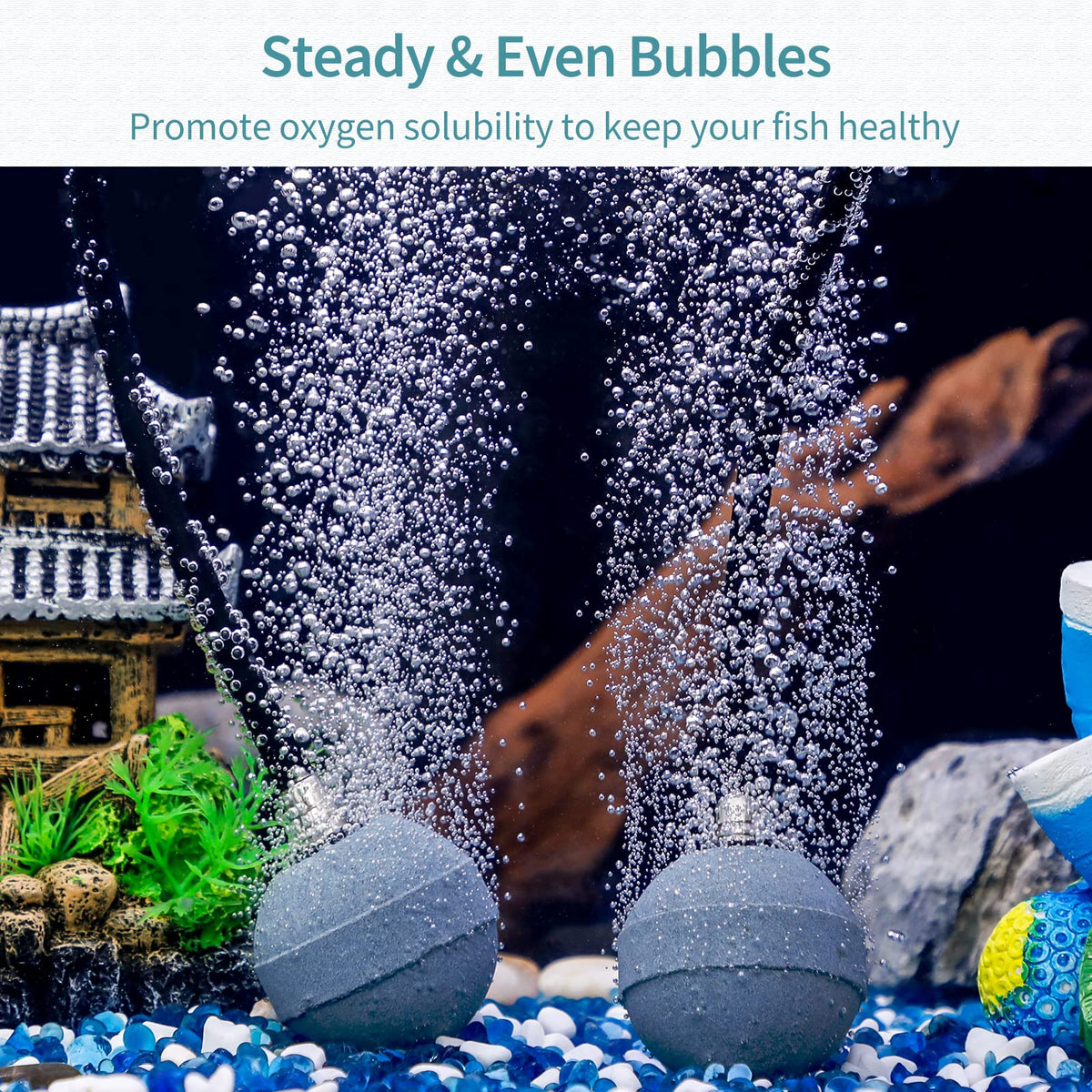 Q: How do I prepare the air stone balls before using them in my aquarium?A: Before using the air stone balls, soak them completely in water for 1 hour to ensure they function effectively and produce steady bubbles.