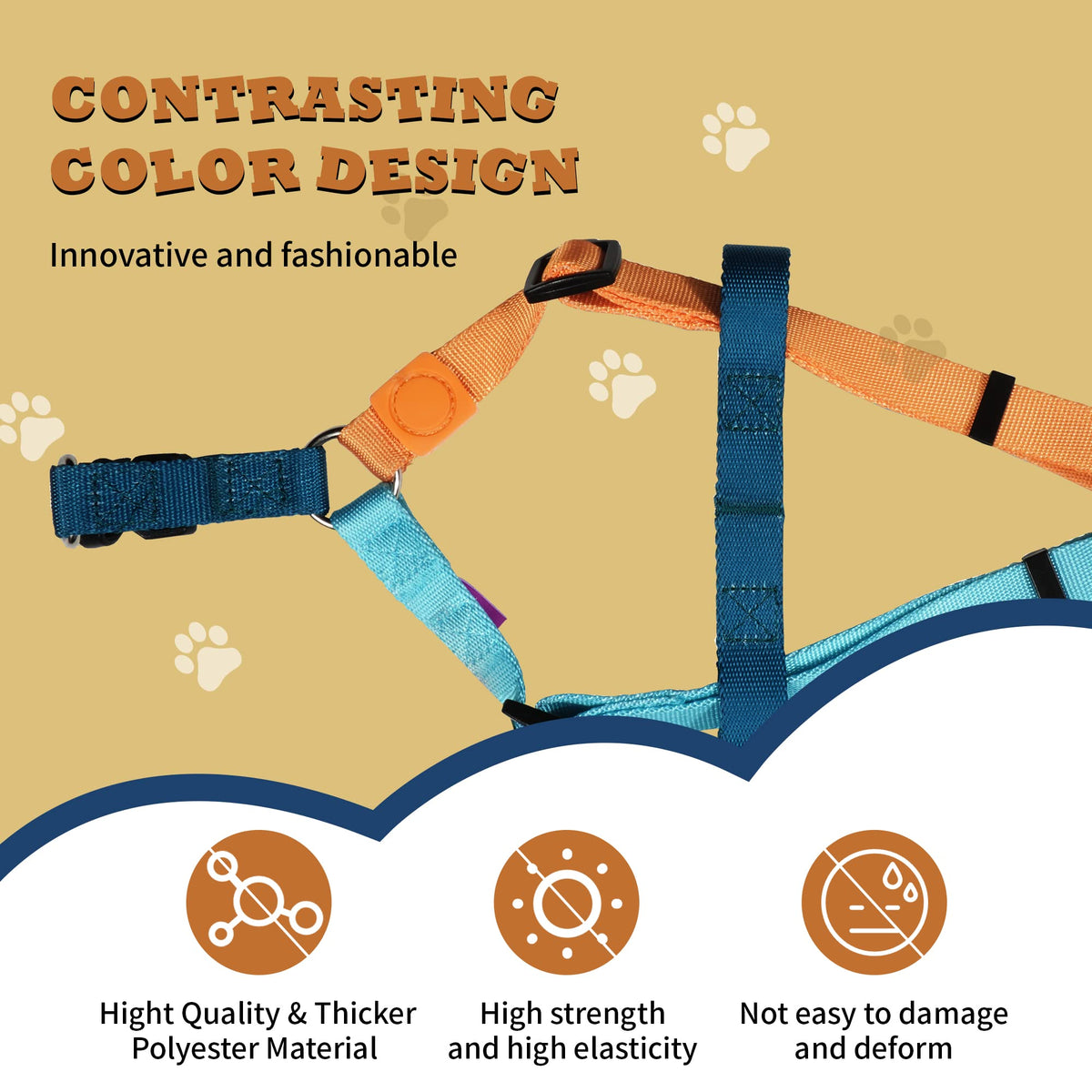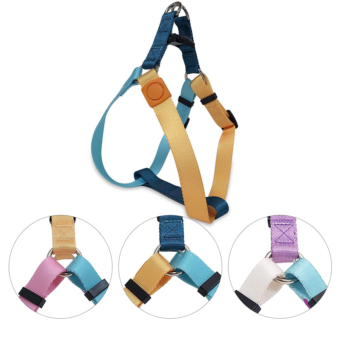 Q: What makes the Pawhuggies Tri-Color Dog Harness different from other harnesses?A: The Pawhuggies Tri-Color Dog Harness stands out due to its fashionable tri-color design, durable construction, and adjustable fit. It is specifically designed to prevent pulling, ensuring easier walks for both you and your dog.
