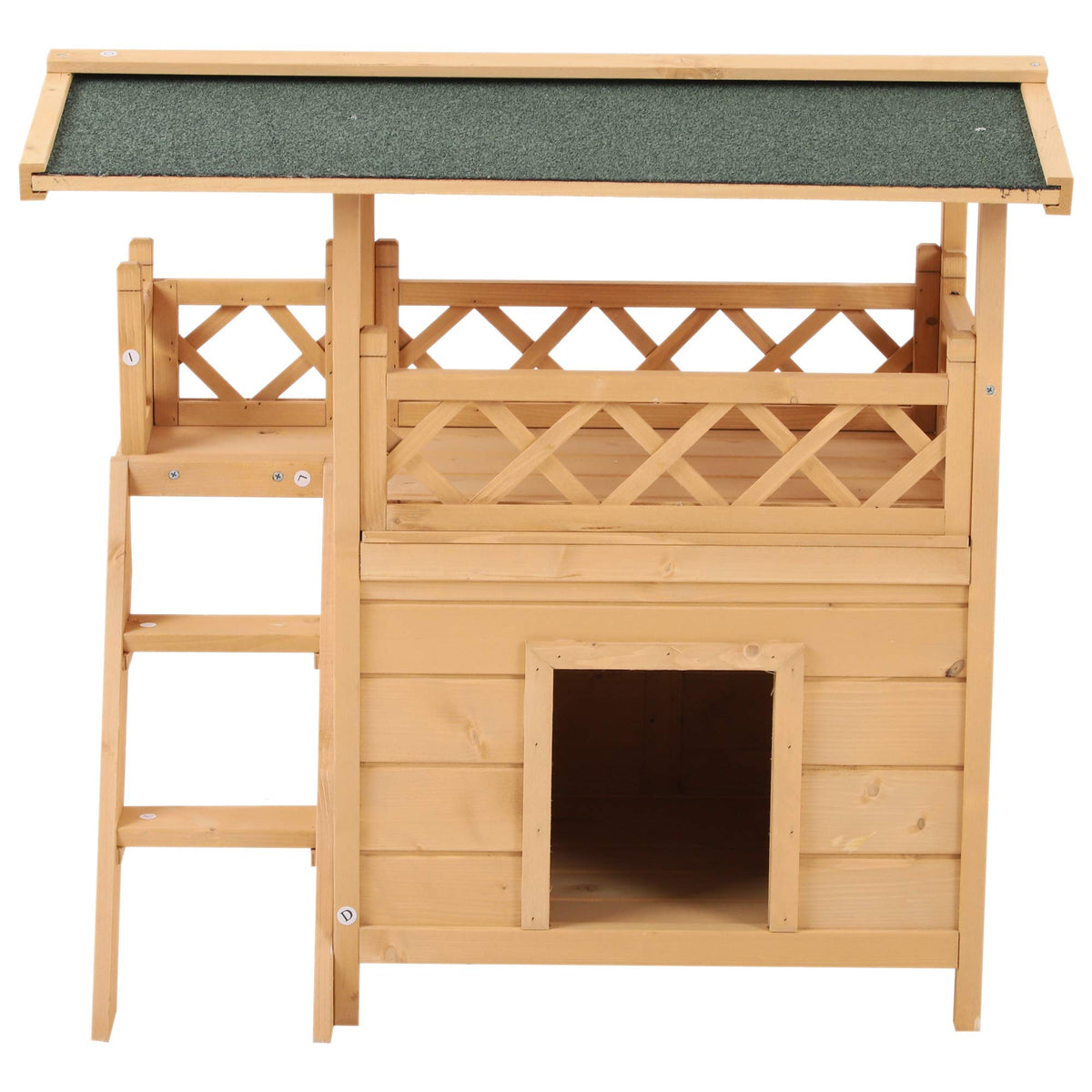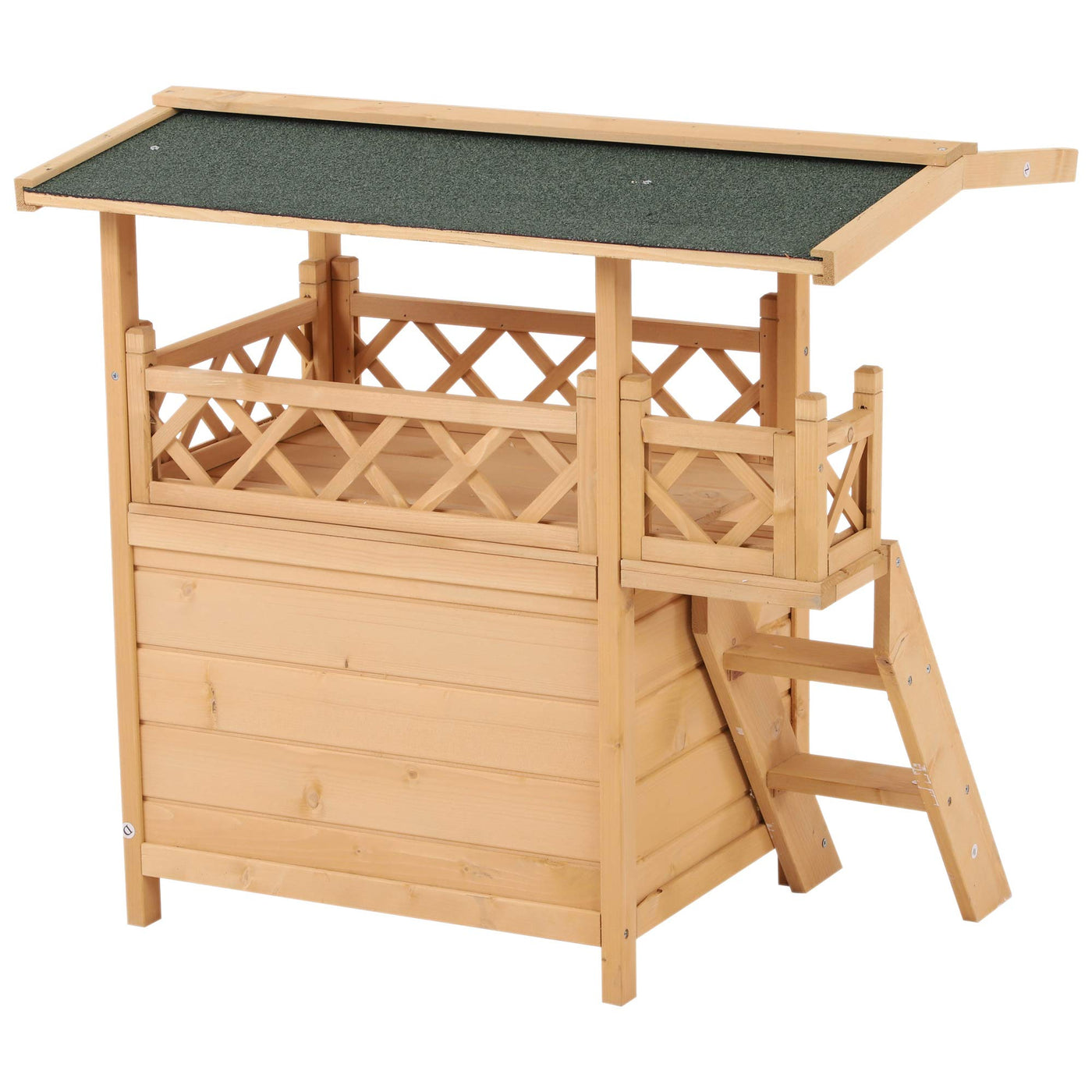Pawhut's 2-Story Cat Shelter with Roof is a wonderful addition to any indoor or outdoor space and ideally made for the smaller animals in your life. It's designed to compliment and enhance your existing surroundings with a classic and appealing design that both you and your pets will appreciate. Features: - 2-story wooden cat house with roof and weatherproof finish - Includes indoor lounge, climbable stairs and a rooftop balcony with railing - Makes a perfect outdoor shelter for cats and small dogs - Weather-resistant, water-based paint ideal for outdoor use - Raised base for extra protection from the elements - Lightweight, durable and easy to handle - Simple assembly with instructions and all hardware included Specifications: - Color: Natural Wood - Material: Fir Wood - Overall Dimensions: 30.5'L x 20.5'W x 28.5'H - Indoor Lounge Dimensions: 18'L x 13.25'W x 12.5'H - Rooftop Dimensions: 18.75'L x 13'W - Railing Height: 4.75' - Stair Size: 6'W x 15.5'H - Door Size: 6.5'W x 7.75'H - Roof Size: 30.5'L x 20.5'W - Space Between Steps: 5.5', 4.25', 3.25' - Feet Height: 2' - Net Weight: 28lbs