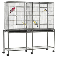 Description:Keep your pet stimulated, secure, and happy with an indoor flight cage with a rolling stand from PawHut. This bird stand with wheels includes multiple wood perches and plastic food containers for your birds to enjoy. Youll be able to easily access your bird food, water, and the inside area of this bird play standing has multiple doors. The front slide-out tray on the bottom is designed to catch birdseed and slides out to make clean up a breeze.Features:? Solid metal frame, steel wire, and durable plastic construction, durable to last for years - Ideal for small to medium-sized birds - Large front doors and side doors for bird easy access to the inside area - Included sliding feeding doors for easy access to your bird food, water - Includes wooden perches and plastic food containers - The main body is detachable for easy transport - Quick clean with the bottom slide-out plastic tray - Universal wheels ensure quick and secure movement - The bottom shelf can be used to place some pet supplies - Assembly requiredSpecifications:? Color: Black, Gray - Material: Metal, Steel, Plastic, Wood - Overall Dimension: 30.25L x 18.5W x 64H - Bird Cage Dimensions: 30 L x 18.25 W x 33.75 H - Front Door: 10.75 L x 21 H - Feeding Door Size: 3.25 L x 5.25 H - Side Door Size: 6.25 L x 5 H - Bottom Tray Size: 29.25 L x 18 W x 1.25 H - Wood Perch Size: F0.5 x 19 L - Food Container Size: 3.25 L x 3 W x 2 H - Bottom Shelf Size: 32 L x 19 W x 6 H - Weight Capacity (Bottom Shelf): 66 lbsPackage Includes:? 1 x Bird cage - 4 x Wood perch - 4 x Food container - 1 x Bottom Tray - 1 x Manual