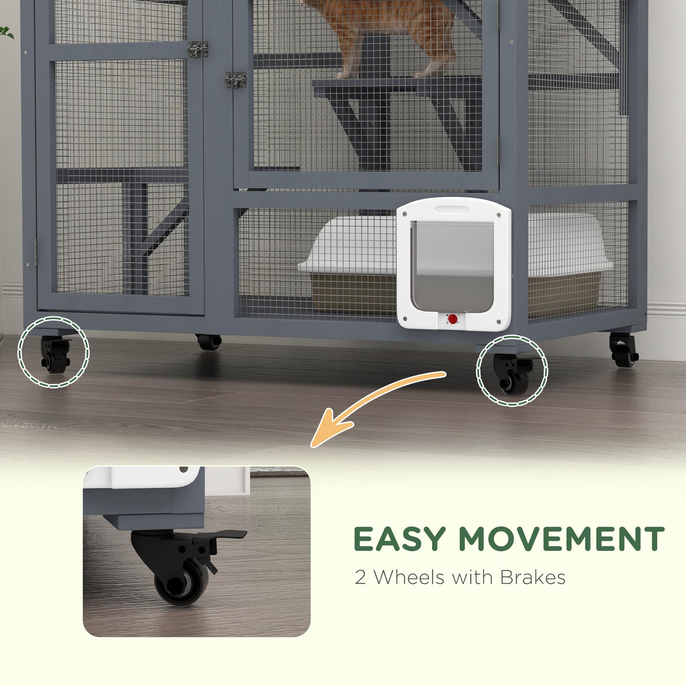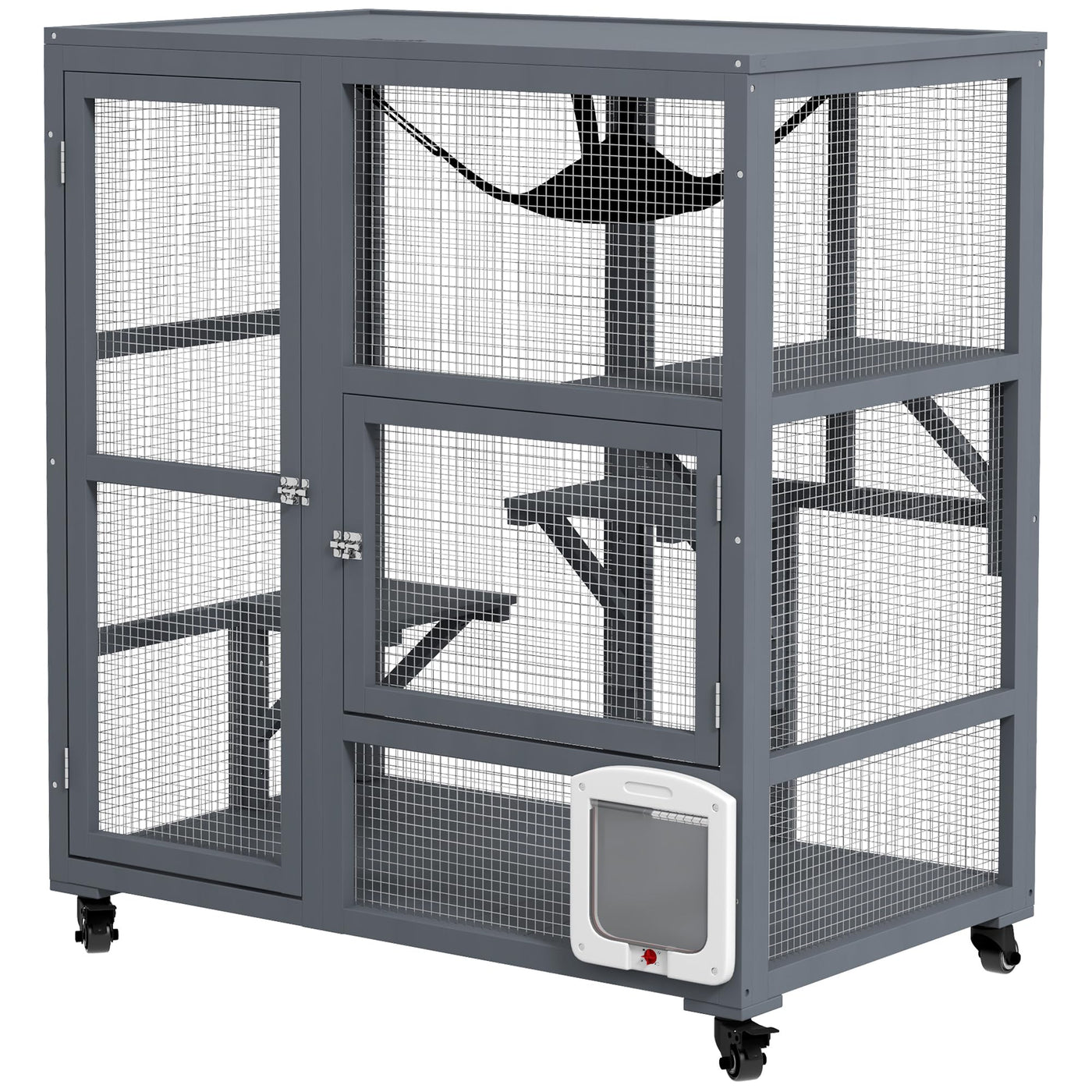 Pawhut Indoor Wooden Catio, Cat House Cat Enclosure On Wheels With 3 Platforms, Hammock, Cat Flap Door & Openable Top, Luxury Ki