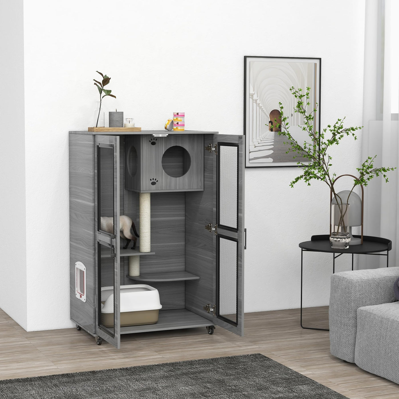 Description:This Play And Nap Space Is Built With A Cabinet Design That Gives Kitties Who Love To Hide A Hiding Spot Inside A Hiding Spot, And A Dark Setting To Relax And Play. Open Up The Doors To Reveal A Cat Tower With A Sleep Spot That Has The Heights Feline Friends Love, Where A Soft Cushion Creates A Cozy Environment. This Pawhut Furniture Lets Your Pet Climb, Play, Scratch, And More, While Giving Them A Cozy, Comfy, And Happy Experience.Features:? Cabinet Design Offers A Cat Room Featuring A Hiding Spot Inside A Hiding Spot For Cats Who Love To Hide, With Closable Mesh Doors That Create A Dark Setting ? Multi-Level Jumping Platforms And Two Sisal Scratching Posts ? A Box Up High With A Soft Cushion Inside ? Wheels Make It Easy To Move The Cabinet Around ? Magnetic Front Doors For Fast Closure, And Cat Door On Side ? Cushion Is Machine Washable ? Suitable For Cats Up To 10 Lbs. ? Assembly Requiredspecifications:? Color: Gray ? Materials: Particle Board, Plush, Polypropylene Cotton, Sisal ? Overall Dimensions: 31.5 W X 19.75 D X 48.5 H ? Interior Dimensions: 30 W X 18.5 D X 45.25 H ? Door Dimensions: 15.75 W X 45 H (Each) ? Flap Door Dimensions: 6 W X 5.75 H ? Platform Dimensions: 16.25 L X 9.5 W / 17.5 L X 11 W ? Condo Dimensions: 16.5 L X 11.75 W X 14 H, Opening: 7.75 Dia. ? Cat Scratcher Dimensions: 2.75 Dia. ? Cushion Dimensions: 15 L X 11.5 W X 2 H ? Off The Ground: 2 H ? Wheel Dimensions: 1.5 Dia. ? Weight Capacity: 22 Lbs. (Top/Bottom), 18 Lbs. (Platforms/Condo) ? Item Label: D32-015V00Gypackage Includes:? 1 X Cat Cage ? 1 X Manual