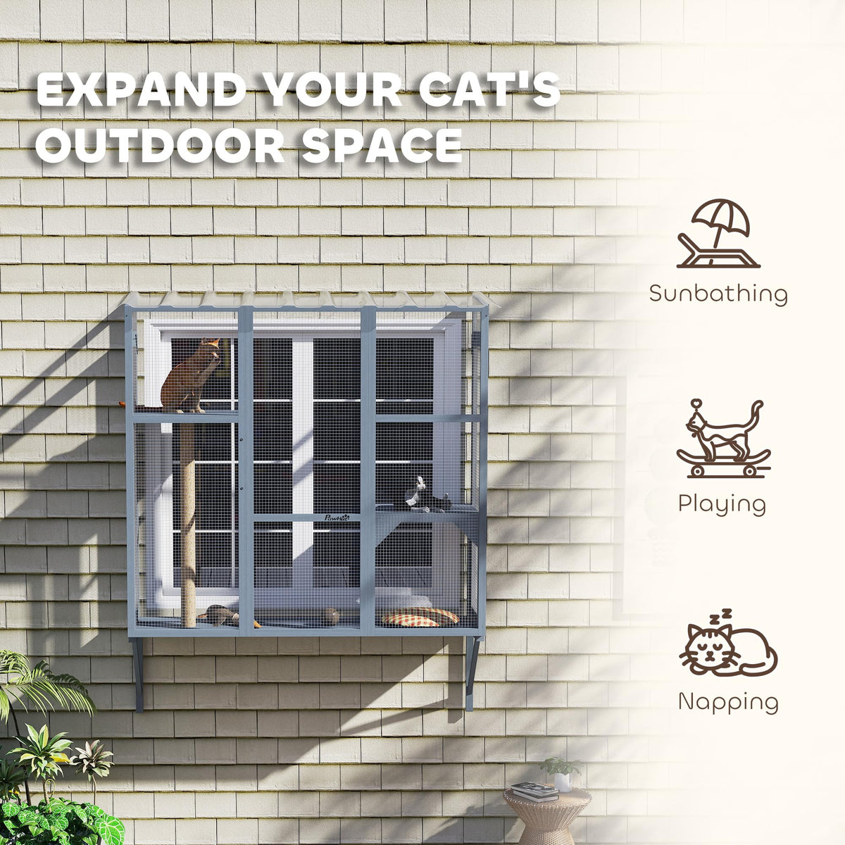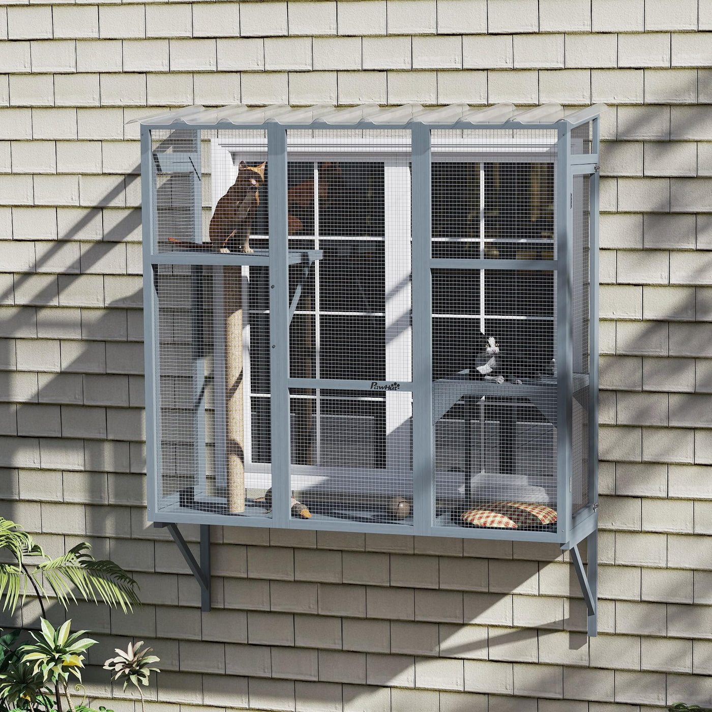 Description:Transform Your Cat'S Life With The Pawhut Catio! This Cat Run Expands Your Furry Friend'S World, Allowing Safe, Nature-Filled Adventures. Equipped With A Safety Net, It Shields Your Cat From Dangers While Offering Ample Space On Its 3-Tier Design, Including Jumping Platforms. Suitable For 2-3 Cats To Explore The Great Outdoors Securely.Features:? Expandable Windows Enhance Outdoor Space And Natural Interaction For Cats ? Safety Net Protects Cats From Vehicles And Predators Outdoors ? Features Three Levels With Two Platforms And A Scratching Post ? Suitable For Housing 2-3 Cats Comfortably, Each Up To 22 Lbs. ? Constructed From Robust Fir Wood For Longevity ? L-Shaped Angle Metal And Expansion Screws Ensure Secure Fixing ? Two Side Doors For Easy Access Inner And Clean ? Assembly Requires Two People And Approximately Two Hoursspecifications:- Color: Gray - Material: Fir Wood, Plastic - Overall Dimensions: 63.8'' W X 19.7'' D X 60.6'' H - Inner Space: 62.2'' L X 18.9'' W X 59.8'' H - Front Eave Height: 59.1'' - Jumping Platform: 47.5W X 47.5D, 20.5'' W X 18.7'' D - Door Size: 16.1'' W X 53.5'' H - Scratching Post: 2.4'' Dia. X 38.4'' H - Mesh Grid: 0.5'' L X 0.5'' W - Maximum Load: 22 Lbs. - Item Label: D32-038V00Gy Note: Installation Requires A 17.7'' Height Space Under The Bottompackage Includes:? 1 X Catio ? 2 X Jumping Platforms ? 1 X Scratching Post ? 1 X Manual
