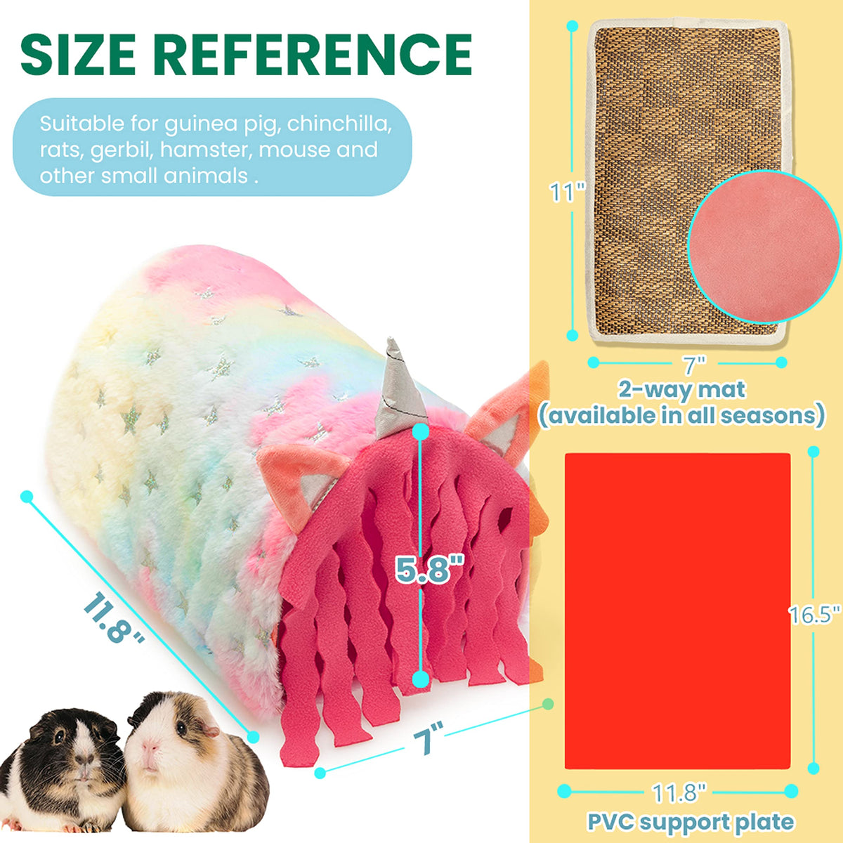 This is a pet hideout cage bedding specially designed for small animals. The dimensions of the tunnel house are: 11.8 '' length 5.8 '' high and 7 '' wide; the dimensions of the dual-purpose mat are: 11 '' length 7 '' wide. Suitable for guinea pigs hamsters chinchillas hedgehogs pygmy rabbits and other small animals (note : it is not suitable for larger animals such as ferrets.)