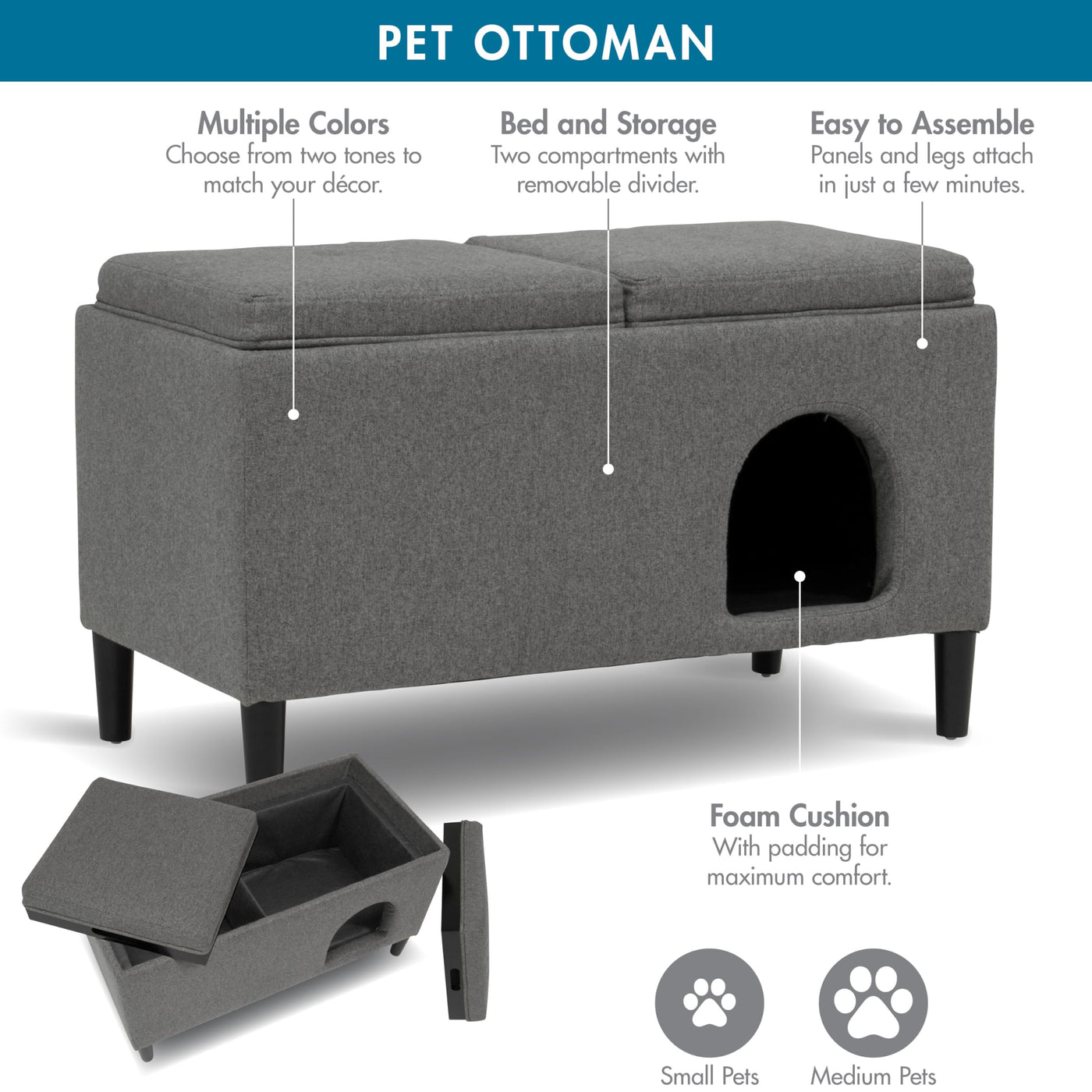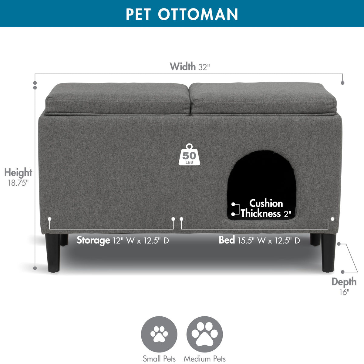 Boasting Dimensions Of 32'' W X 16'' D X 18.75'' H, This Ottoman Seamlessly Fits Various Interiors, Offering Both Style And Convenience. At Its Core, The Pet Bed Compartment Of 15.5'' W X 12.5'' D Ensures A Snug, Inviting Sanctuary For Your Beloved Pet. Remove The Middle Panel For More Room For Your Pet. The Thick 2'' Foam-Padded Cushions Promise Unparalleled Relaxation, While The User-Friendly Zippered Covers Add A Touch Of Effortless Maintenance. For Those With Larger Pets, The Ottoman Is Ingeniously Designed With A Removable Middle Panel, Allowing The Oed To Expand. Dual-Padded Covers Atop The Unit Effortlessly Convert Into An Elegant Footrest, Blending Seamlessly With Your D Cor. Assembly Is A Breeze, Getting You From Box To Bliss In Minutes. With A Robust Weight Limit Of 50 Lbs., Our Ottoman Is Tailor-Made For The Comfort Of Small To Medium-Sized Pets. Elevate Both Your Pet'S Lifestyle And Your Living Space With This Multifunctional, Exquisitely Crafted Pet Otttoman.