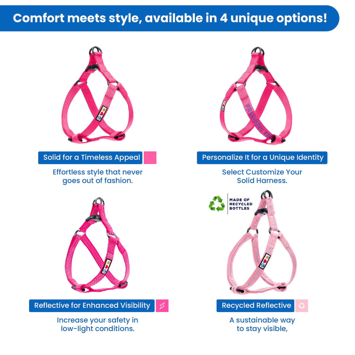 Introducing our Reflective Step-In Dog Harness, the perfect blend of style, comfort, and functionality for your furry companion. Available in extra small, medium, and large sizes, this adjustable harness is designed to cater to the unique needs of dogs of all sizes, from playful puppies to majestic adults. Key Features: No Pull Design: Say goodbye to the struggles of walking your dog with our no-pull dog harness. The innovative design ensures a secure and comfortable fit, preventing your dog from pulling excessively during walks. Puppy-Friendly: Crafted with the comfort of your little ones in mind, this harness is suitable for puppies, providing them with the support they need as they grow. The lightweight material ensures that your puppy can move freely without any restrictions. Reflective Dog Vest with a Versatile Use: More than just a puppy harness, our product is a versatile addition to your dog accessory collection. Whether you're looking for a reliable everyday harness, a service dog harness, or a stylish option for your French Bulldog or Chihuahua, our step-in harness is the perfect choice. Reflective for Safety: Safety is our top priority. The reflective features of our harness enhance visibility during low-light conditions, keeping your dog visible and safe during evening walks. Easy to Wear: The step-in dog harness design makes it a breeze to put on and take off, reducing the hassle for both you and your furry friend. Simply have your dog step into the harness, secure the straps, and you're ready for a walk in style. Upgrade your dog's walking experience with our Reflective Step-In Dog Harness. A set of matching Dog Collar and 6ft Dog Leash are available. Explore the world together while enjoying the ease, comfort, and security that our adjustable, lightweight harness provides. Because every step should be a joyous adventure for your beloved companion.
