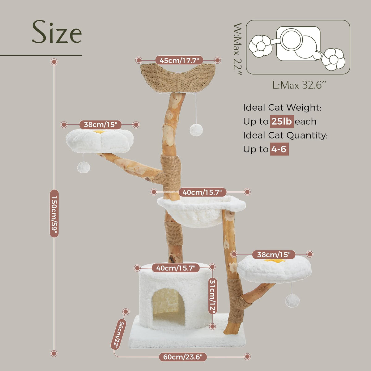 Pawz Road Cat Tree - A Tall Cat Tree Tower Crafted For Indoor Cats Large Adult, Blending Boho Cat Tree Aesthetics With Solid Wood Cat Tree Durability. This 59 Cat Tower Features Natural Wood Posts, Handwoven Rattan Accents, And Tiered Platforms To Create A Boho Cat Tower Haven For Multi-Cat Households. Designed As Cat Trees For Large Cats, Its Spacious Structure Includes A Rattan Basket, Plush Hammock, Bottom Hideout, And Two Floral Perches - Comfortably Supporting 4-6 Cats Up To 25Lbs Each. Each Level Is Wrapped In 500G/M Cloud-Soft Plush, While The Solid Wood Tall Cat Tree Tower Design Ensures Wobble-Free Stability With A 2X-Thickened Base And Reinforced Posts. The Boho-Inspired Cat Tree Maximizes Vertical Space For Climbing And Perching, Satisfying Feline Instincts To Survey Their Territory. Easy Assembly And Earthy Materials Make This Cat Tree For Indoor Cats Large Adult A Seamless Fit For Modern Or Eclectic D Cor. From Lounging In The Woven Nest To Leaping Between Platforms, This Durable Cat Tower Delivers Safety, Style, And Endless Adventure For Your Furry Family.