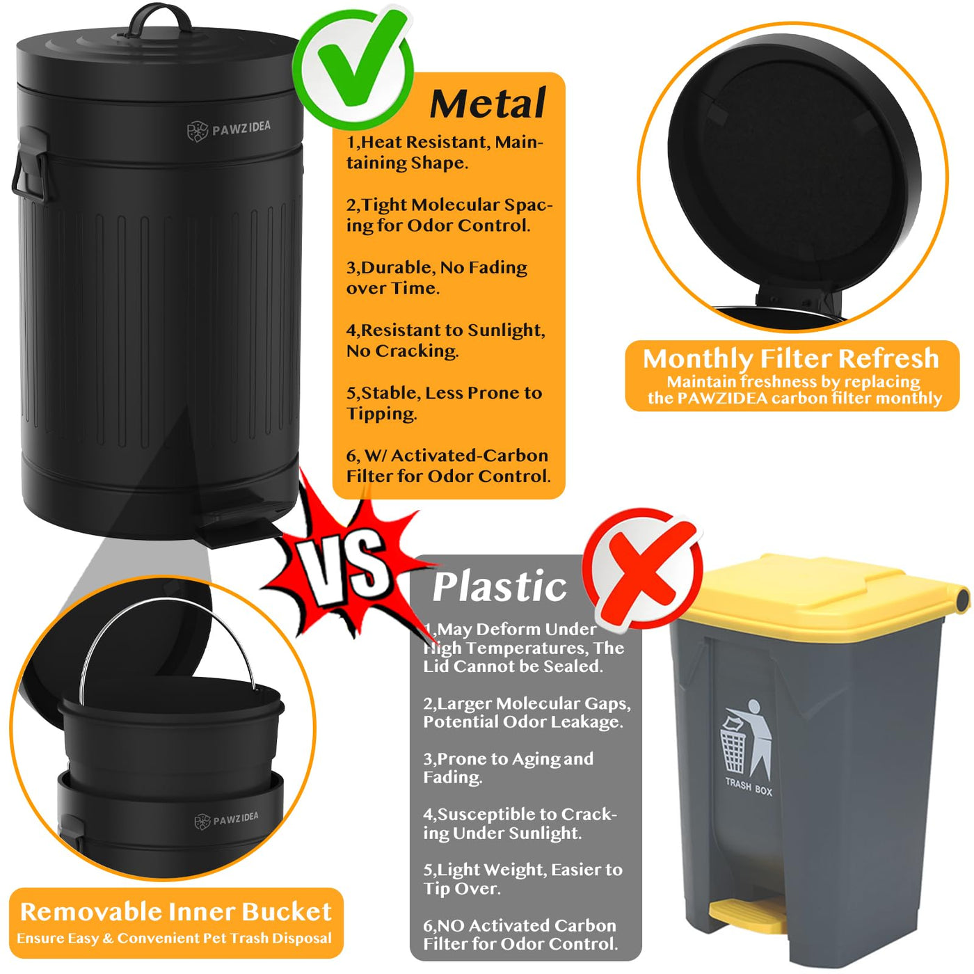 12-Liter/3.1 Gallon Capacity: Comfortably Store Enough Dogs Waste Until Trash Day. 5-Liter Waste Bins Are Too Small And Must Be Dumped Frequently. Discover The Unmatched Superior Durability, Shape &Amp; Odor Control Of Metal Trash Bins: Your Pet Waste Solution That Stands The Test Of Time And Temperatures! Odor Control: Say Goodbye To Dog Waste Odors With Pawzidea Poop Trash Can Outside! It Comes With A Replaceable Carbon Filter That Traps Any Smell Under The Metal Lid (Not Deform Even At High Temperatures). And Additional Eva Gaskets Seal Better And Control Odor - 20% More Than Others! Hands-Free: Step Dog Waste Trash Can With Soft-Close Foot Pedal, Uses A Strong And Durable Foot Pedal Design, Chrome-Plated Rustproof Process. Outdoor Standby: Enhanced With A Protective Uv-Resistant &Amp; Multi-Layer Paint Coating Was Used. Weather Resistant, Rust Resistant, Rust Cracking, And Fade Resistant. Easy To Use: Removable Inner Bucket And Carry Handle Ensure Easy, Convenient Pet Waste Disposal. Also For Cat Litter Disposal, Bathroom, Kitchen, Etc. Conveniently Use Any Standard Trash Bag (Recommended Trash Bag Size Is 4 Gallons). Unmatched Durability Of Metal Trash Bins: Heat Resistant, Shape Preserving &Amp; Odor Control- Unlike Plastic Bins That May Warp Or Melt, Our Metal Bins Withstand High Temperatures Outdoors, Keeping Their Form And Function Intact. The Robust Construction Ensures A Long-Lasting Pet Waste Solution That Resists Aging And Maintains Stable Performance Through The Years. Thanks To The Tight Molecular Spacing Of Metal, Our Bins Excel At Trapping And Containing Odors, A Feature Plastic Bins Struggle With Due To Their Larger Molecular Gaps. This Means A Fresher, Cleaner Area Around Your Bin. Monthly Filter Refresh: Maintain Freshness By Replacing The Pawzidea Carbon Filter Monthly, Available At Our Store.