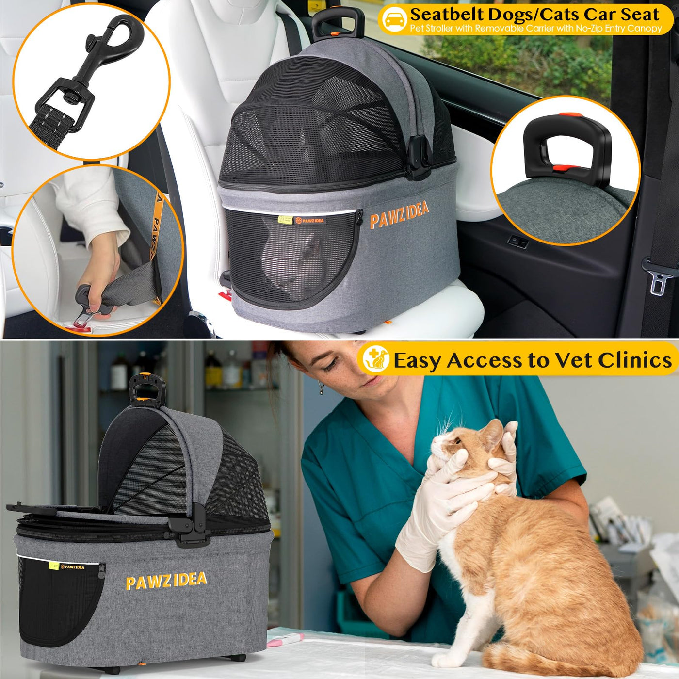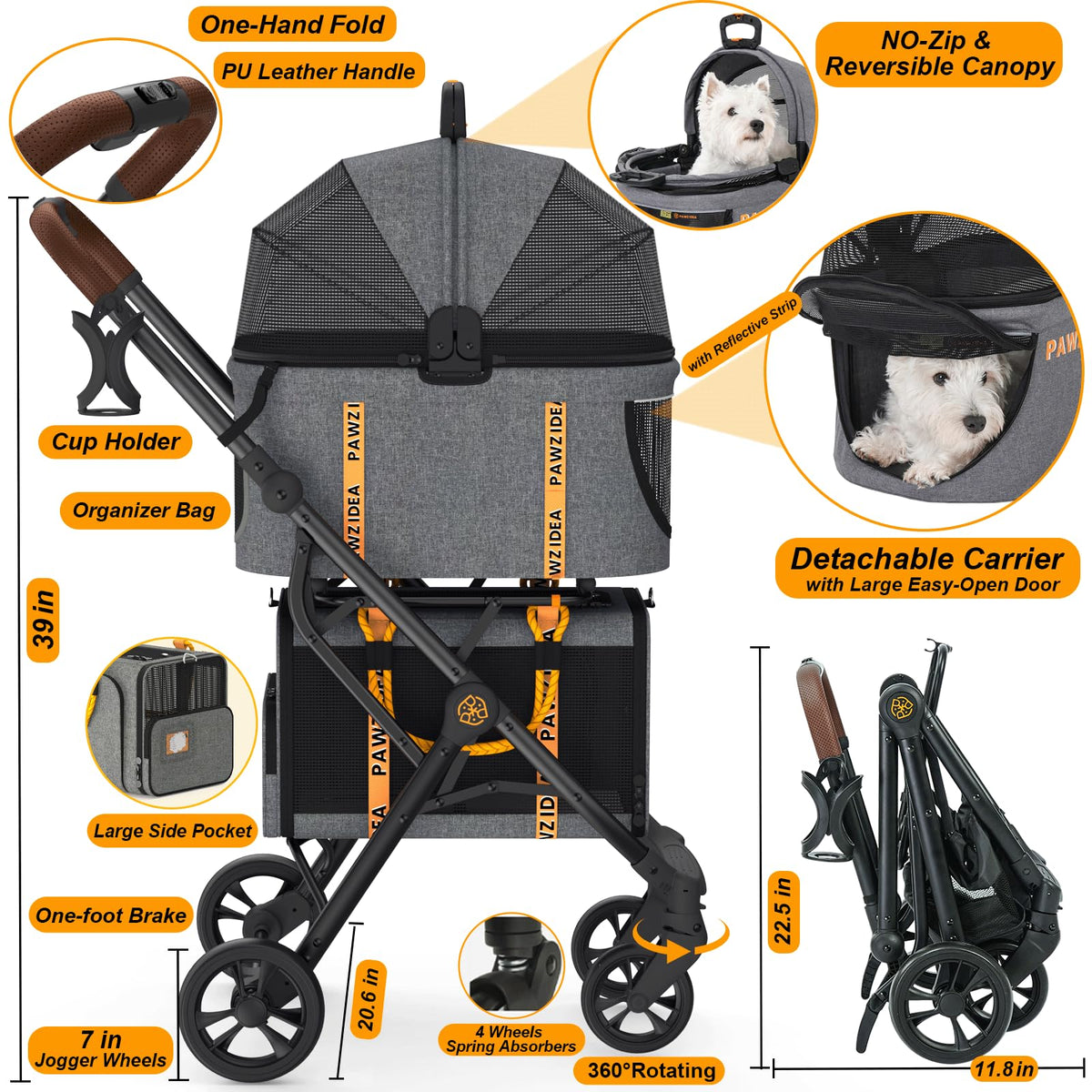 Double-Layer Design: The Pawzidea Double Pet Stroller Adopts An Innovative Double-Layer Design To Provide More Space And Convenience For Pet-Raising Families. Pet Owners Can Place Their Pets Separately In The Upper Carrier And The Lower Carrier To Provide A Safe And Comfortable Travel Environment For Their Furry Children. Removable And Washable Canopy And Seat Cushion. Pet Stroller With Removable Carrier With A Larger Easy-Open Zipper Door Allows Your Fur-Kids To Get On And Off The Puppy Stroller Freely. Easy-Locking &Amp; No-Zip Entry Canopy - No Struggling With Zippers! Could Prevent Sunlight &Amp; Have A Great View For Your Fur-Kids &Amp; Interior Breathable And Bright, Easier To Keep A Close Eye On Your Pet When Pushing Dog Cat Cage Jogger Stroller. Easy To Assemble &Amp; Fold - One-Handed Quick-Fold Lightweight Aluminum Frame (Only 10Lb) For Easy Storage And Transportation, Stand Independently Without Pu Leather Handle Touching The Ground. One-Foot Brake Can Easily Stop The Dog Stroller. With Cup Holder And X-Large Capacity Storage Basket, Easy To Carry Pet Supplies And Toys Outdoors. 4-Wheel Spring Shock Absorber - Pump-Free &Amp; Maintenance-Free Tires, 4-Wheels Front &Amp; Rear Spring Shock Absorbers Suspension To Reduce Vibration And Maximize Stability. Built-In Bearings, 360 Rotating Front Wheel. One More Thing For Your Pet'S Safety - Escape-Proof For Kitties With Canopy Lock &Amp; Anti-Scratch Net &Amp; Thickened Oxford Cloth. Adjustable Safety Straps With Metal Harness Clips For Pet Collars. Rolling Cat Stroller With Detachable Carrier Secured By Anti-Fall Safety Buckles. Load Capacity 22.6Kg/50Lb.