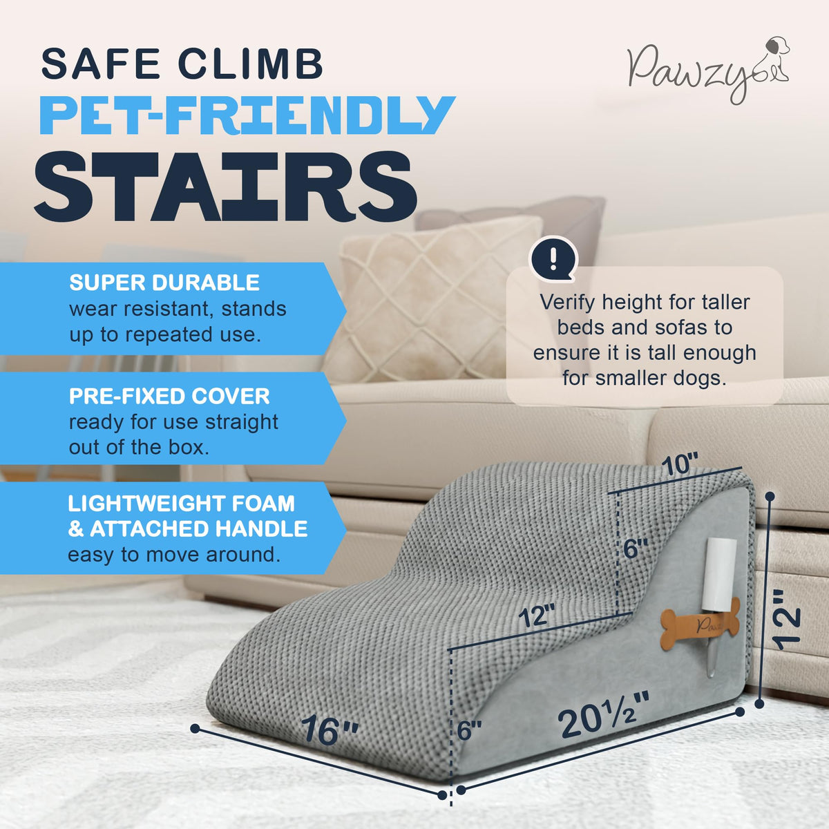 Help Your Pets Reach New Heights - One Step At A Time - With Pet Stairs From Pawzy! Its A Comfort-Filled Climb, Full Of Firm Yet Cushioned Support, Where Every Step Feels Like Cloud Nine. Whether Its A Cozy Nook By The Window, The Master Bed, Or The Living Room Sofa - These Portable Lightweight Steps Whisk Your Pet Off To Their Desired Destination With Zero Pain Or Strain.Features & Benefits:Dimensions: 15.5 H X 22.5 D X 16 Wextra Wide Steps3-Tier Gentle Slopefirm Supportive Foamcomfortable Cushioningnon-Slip Bottomwaterproofwashable Removable Coverlightweight And Portableindoor/Outdoor Useincludes Bonus Lint Rollermount The Mattress, Conquer The Couchdesigned For Pets Of All Ages And Mobility Levels. The Gentle Slope And Wide Steps Support Pets Up To 60 Lbs And Minimize Strain On Knees And Hip Joints - Ideal For Puppies, Senior Cats & Dogs, And Pets Recovering From Injuries.Pee-Proof And Slip-Proofwith A Waterproof Layer Underneath The Soft Fleece Cover, You Never Have To Worry About Accidents Or Spills. The Non-Slip Base Keeps The Steps Firmly Fixed In Place On Both Carpet And Hard Surfaces, Allowing Pets To Climb Up And Down Safely.Portable And Paw-Friendly Designmade From High-Quality Foam Instead Of Heavy Wood Or Folding Metal, These Steps Offer Durability While Being Light Enough To Easily Move Around The Home Or Bring Outside. Durable Wear-Resistant Sides Give Dogs A Safe Surface To Rub Their Paws On And Grind Their Nails Down Naturally.Side Strap With Bonus Lint Rollera Holder Strap Attached To The Side Of The Steps Conveniently Holds A Lint Roller For Quick Clean-Ups, Or You Can Use It To Store Brushes Or Toys.For Pets Who Need A Little Extra Boost To Reach All Those Comfy Places Make Every Favorite Spot Accessible For Your Furry Family Members With Pawzy Pet Stairs.