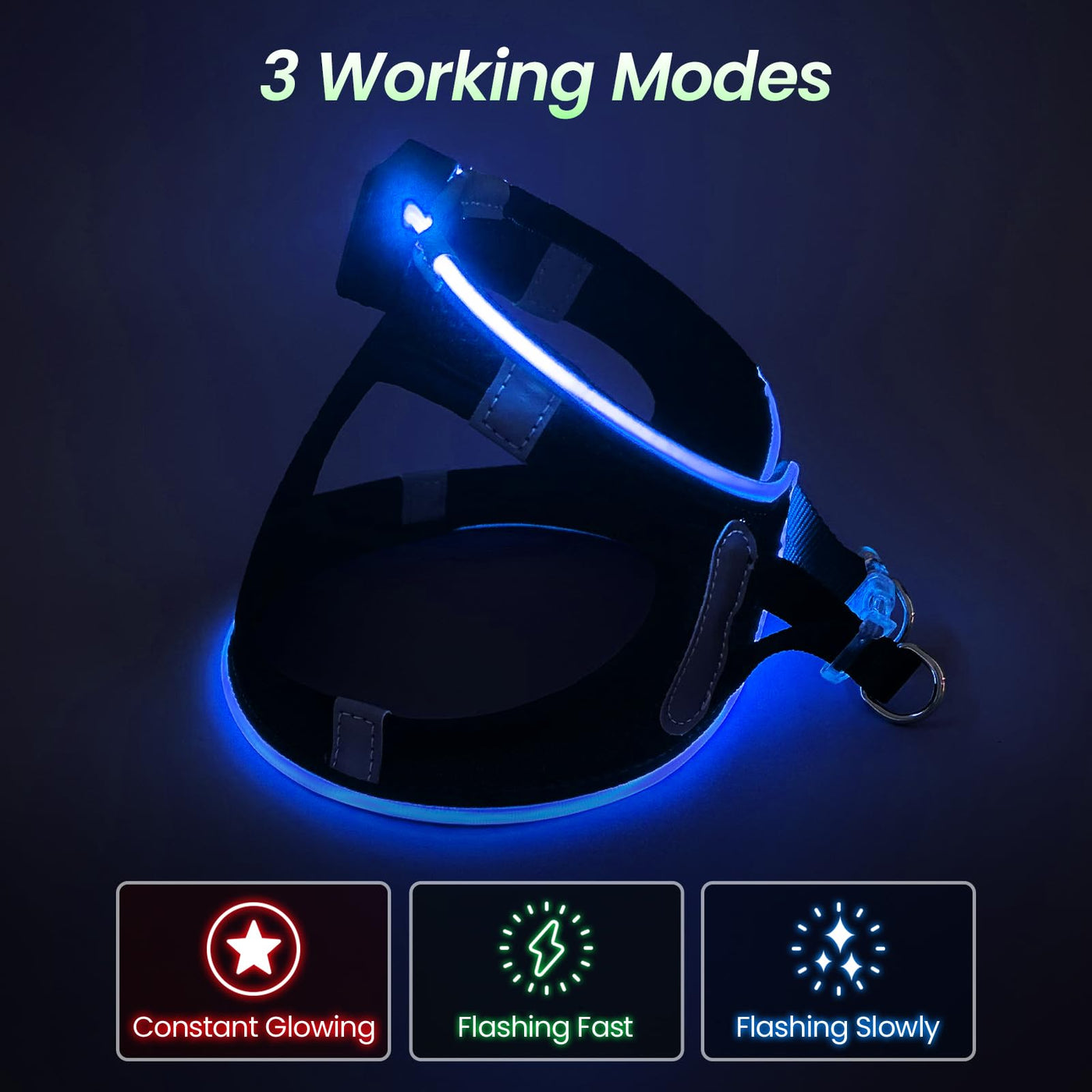 Q: What are the different modes available on the LED dog harness?A: The PCEoTllar harness has three different modes: flashing slowly, flashing fast, and constant glowing. These modes can be easily switched with the press of a button, allowing customization based on your needs.