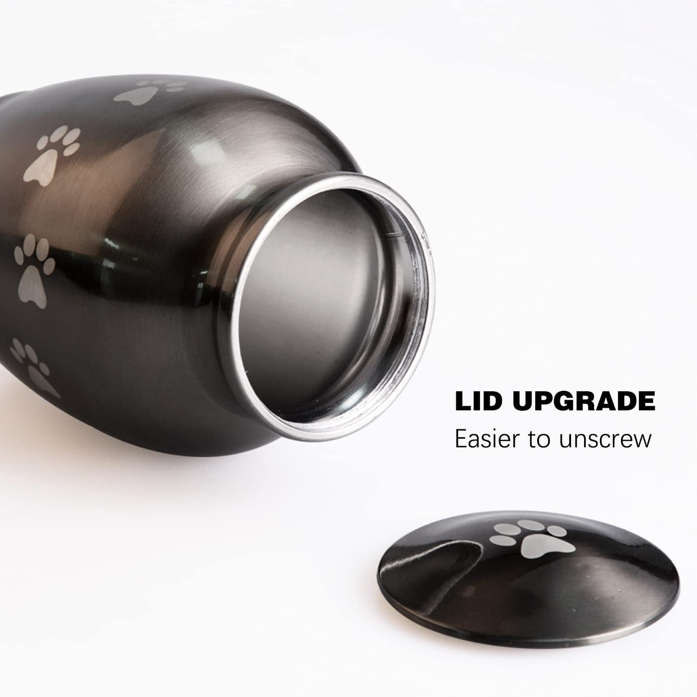 Q: What materials are used in the construction of the urn?A: The PCS Pet Memorial Cremation Urn is made of high-quality stainless steel, offering durability and elegance, along with a design featuring paw prints to honor your beloved pet.