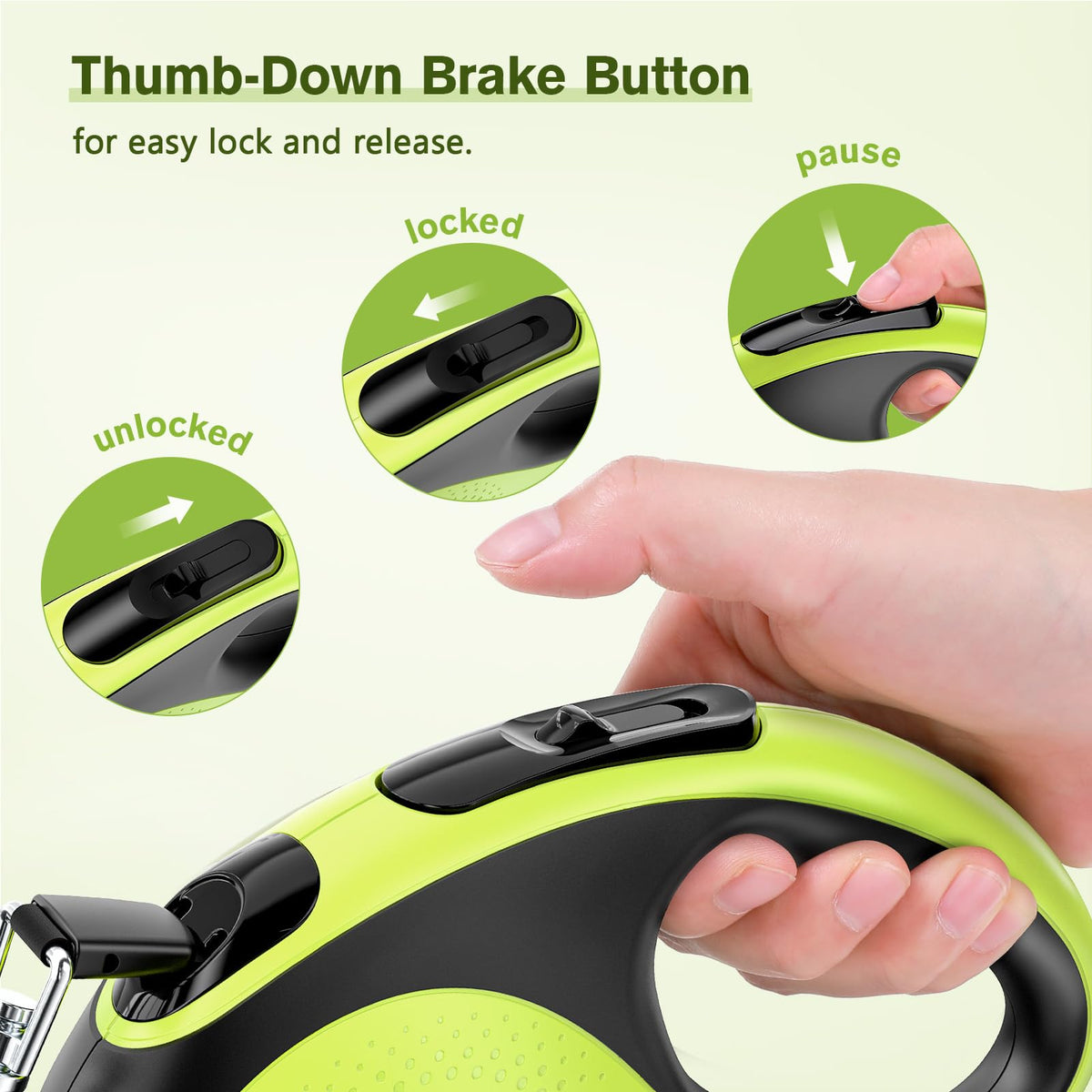 Q: How does the one-button control system work on this dog leash?A: The user-friendly one-button control system allows you to easily release, lock, or retract the leash smoothly, giving your pet the freedom to explore while you maintain control.