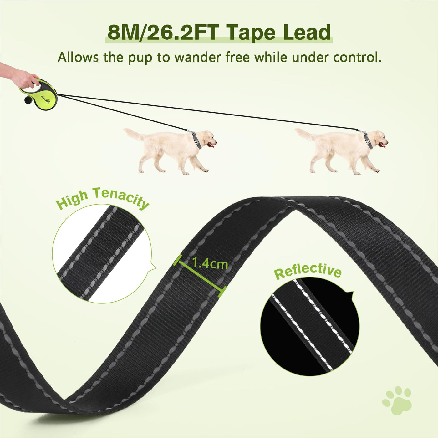 Pecute 26Ft Retractable Dog Leash With Poop Bag Holder, Walking Dog Leash For Heavy Duty Dogs Up To 110Lbs With Strong Nylon Tape, One-Button Control, 360?Tangle-Free Sturdy Long Dog Leash