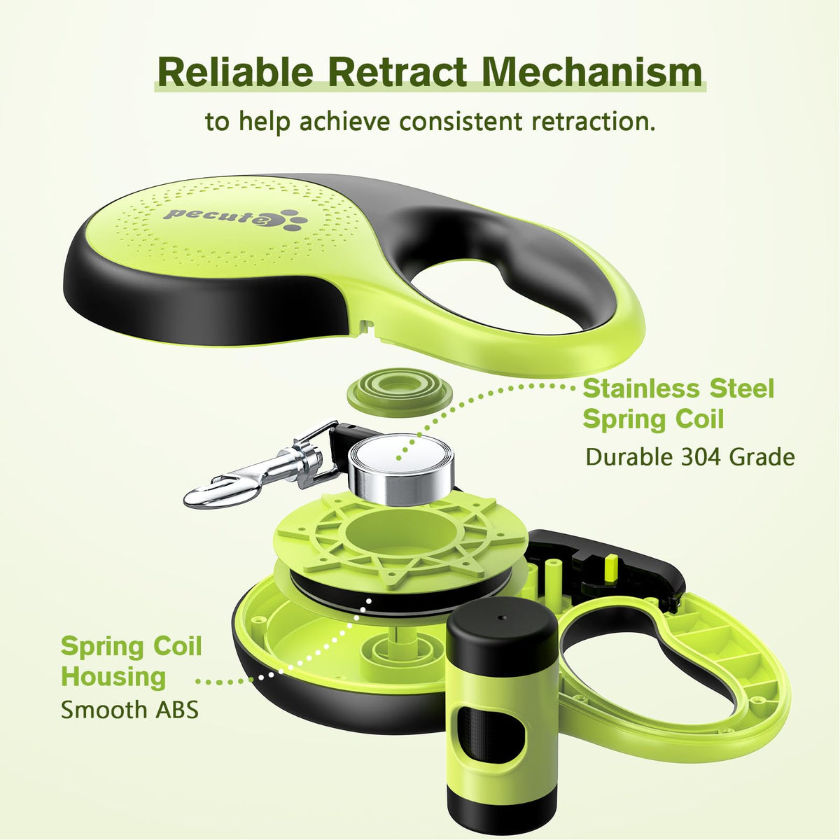 RELIABLE SPRINg MEcHANISM & BRAKINg SYSTEM : The internal mechanism uses high-quality 304 stainless steel spring coils which are strong and flexible and no longer get stuck With the comfortable and easy one-button brake system you can release your furry friend to explore lock the dog leash in place or smoothly retract it Pecutes reliable shrinkage technology provides more freedom for your furry friend while maintaining safety and allowing you to control as you wish 360A TANgLE-FREE DESIgN : The open U-shaped design can correctly guide the leash to smoothly retract from any angle the tail end lock buckle made of galvanized alloy material can also rotate freely 360A and the double detail design prevents the leash from twisting and tangling PREMIUM MATERIAL : The shell is made of sturdy ABS plastic and galvanized alloy hooks durable rust-proof and suitable for outdoor activities The belt is made of high-strength polyester + reflective wire rope sturdy wear-resistant smooth and does not get stuck EASY TO USE : The handle is made of TPE material which is ergonomic and comfortable to hold and prevents hand fatigue during long walks The considerate addition of a portable garbage bin (including a roll of 15 garbage bags) provides dog poop bags conveniently while walking your dog without having to search through your pockets 2 SIZES AVAILABLE S size - 3 m10 ft suitable for dogs weighing no more than 33 lbs XL size - 8 m26 ft (with reflective stripes) suitable for dogs weighing no more than 110 lbs Select the appropriate size whether its for daily walks or long hikes to make your dog walking experience more comfortable and enjoyable 100% SATISFAcTION: Love your new retractable dog leash or your money back We stand behind our products and make sure of your complete satisfaction If your product becomes defective please let our friendly and responsive after-sales support team know We will help you with the return and replacement process