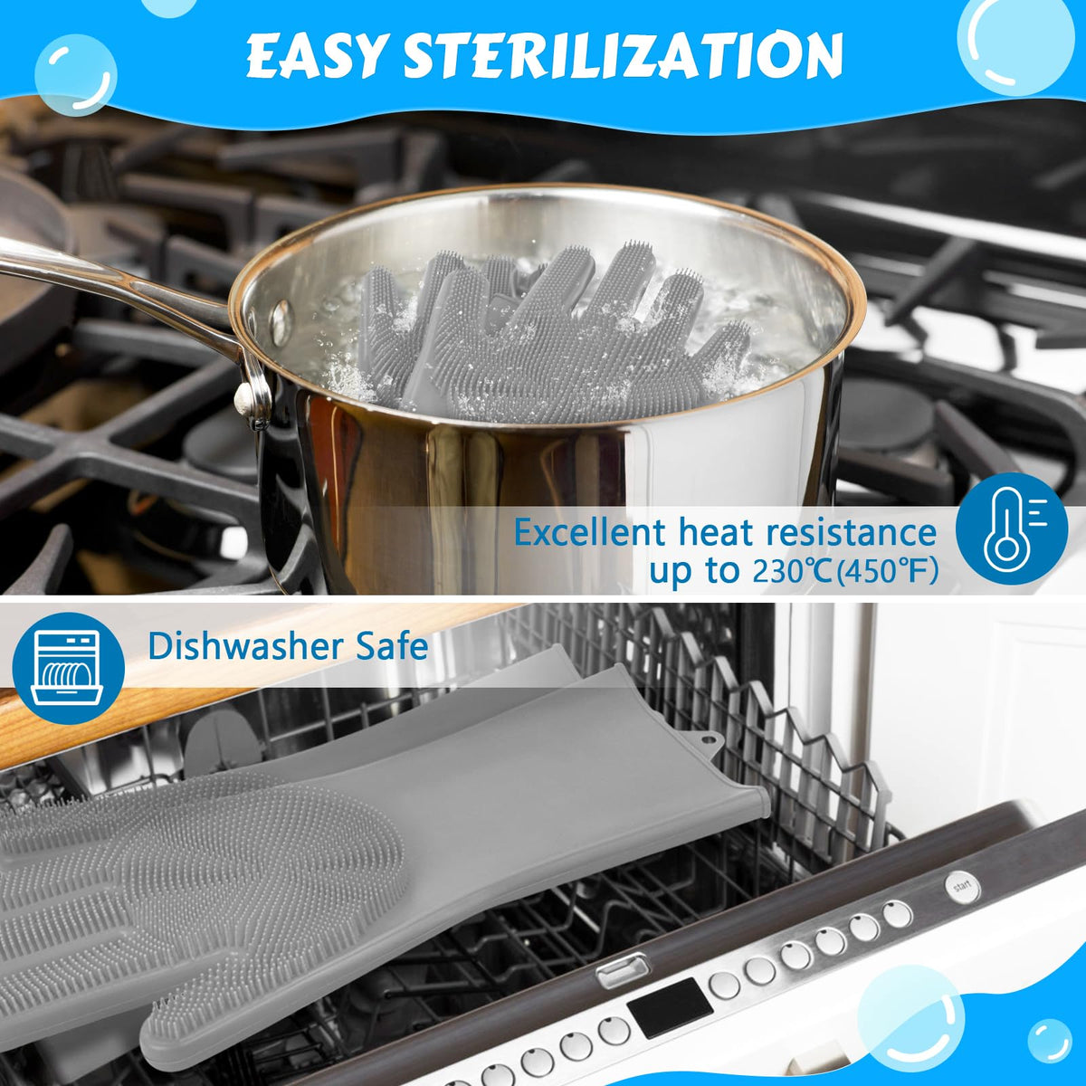 The silicone pet grooming gloves are a 2-in-1 design that combines a cleaning brush and glove. They have 3,000 soft brush heads spread over the magic gloves, which create more foam, increase friction force, and deeply clean the pet's skin. The gloves are made of high-quality silicone, which is non-toxic, high-toughness, and has good elasticity. The anti-skid bumps are non-slip and the extended dog bathing gloves are matched with good elasticity, making them firmly fit on the hand and not easy to fall off. They are suitable for all kinds of furry pets, such as cats, dogs, and rabbits, and can also be used to clean tableware, furniture, cars, clothes, and other items.