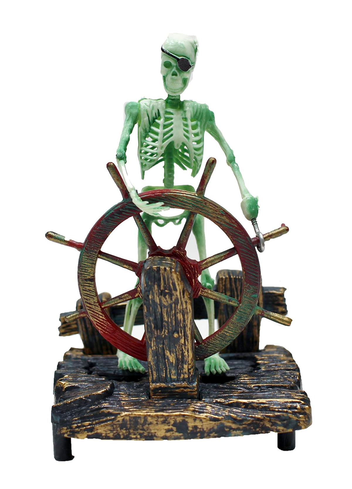 Action-Air presents the Skeleton at the Wheel Aerating Aquarium Ornament by PENN-PLAX.Powered by an aquarium air pump, the pirate's skeleton still mans the helm, swaying left and right with the forthcoming bubbles.This real motion, air driven ornament will provide hours of fun and entertainment inside your fish tank!Aerate Your Aquarium:Our Action-Air ornaments provide an exciting and enjoyable way to aerate your aquarium.While a simple air stone will always do the trick, it’s not the sameas watching the real time movements of these decorations!Please Note:Requires air pump and standard airline tubing to operate.These items are not included in purchase.Made of Safe and Durable Material:Our Action-Air aquarium ornaments are inspected with your fish’s safety in mind.The plastic material used is safe for both freshwater and saltwater aquariums.They also feature a sturdy base that helps keep them grounded in your tank.For best results, cover the ornaments base with your tanks substrate;this could be gravel, sand, or even decorative pebbles and rocks.Super Simple to Clean:Before placing into your tank, or as you as perform regular cleaning and maintenance,simply wipe down and rinse off the aerating ornament with warm water.Never use soap, as the residual soap particles can harm your fish.Measurements:Overall = 4.5” (W) x 2.5” (D) x 5.5” (H)Airline Tube Connector Length = 6”Shop PENN-PLAX for All Your Pet’s Needs:PENN-PLAX is a manufacturer and distributor of top quality pet supplies,who specialize in creating excellent pet products for animals, both great and small.