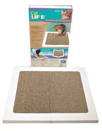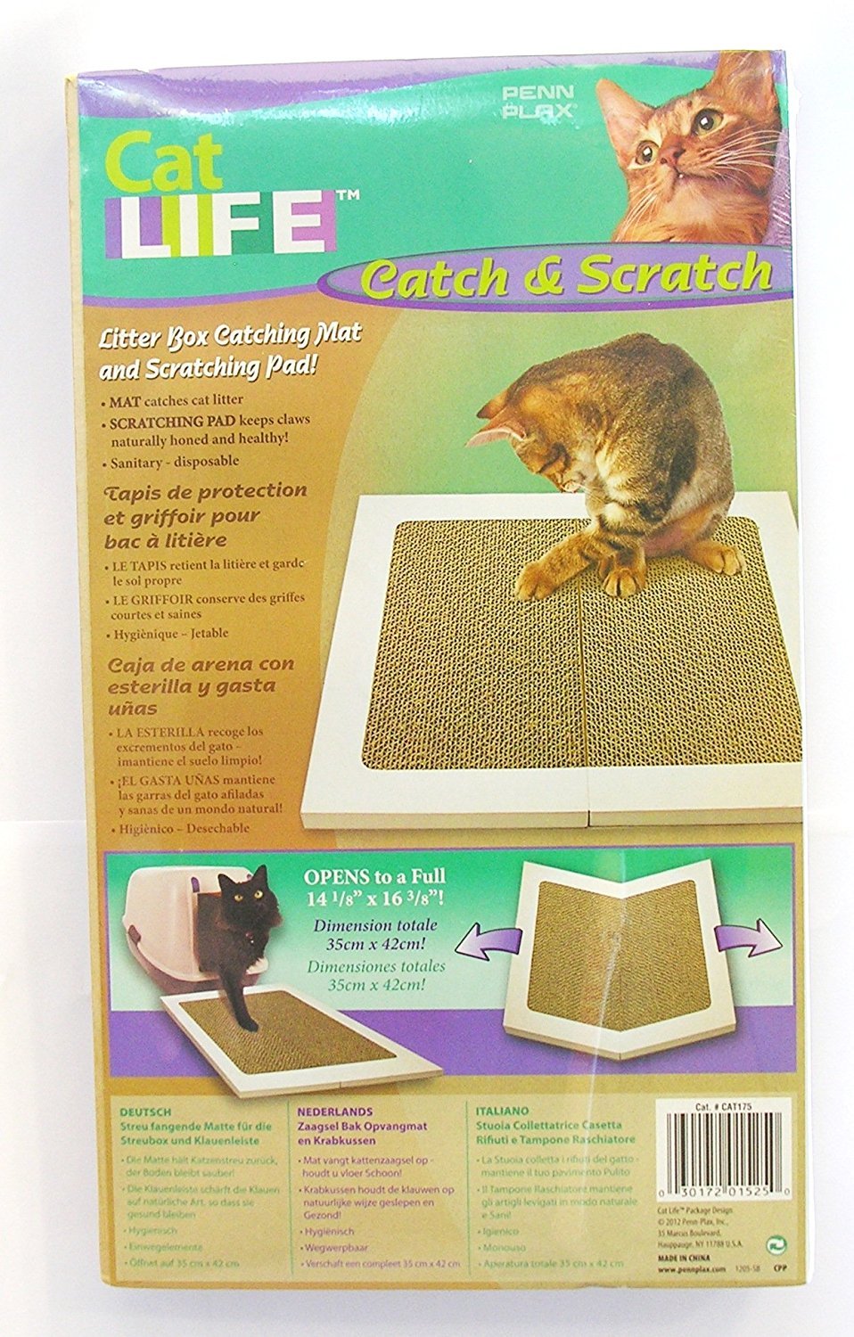 Q: What materials is the Penn-Plax Cat Life Catch & Scratch Scratching Pad made of?A: The Penn-Plax Cat Life Catch & Scratch Scratching Pad is made of sturdy corrugated cardboard, which is designed to be enticing for cats and provides an ideal texture for scratching.