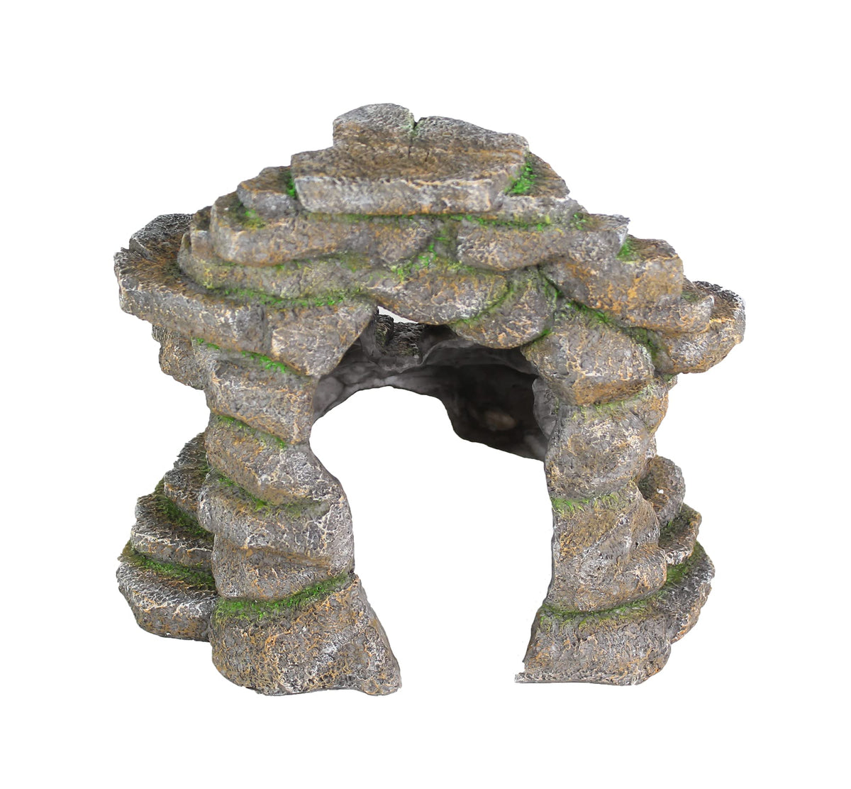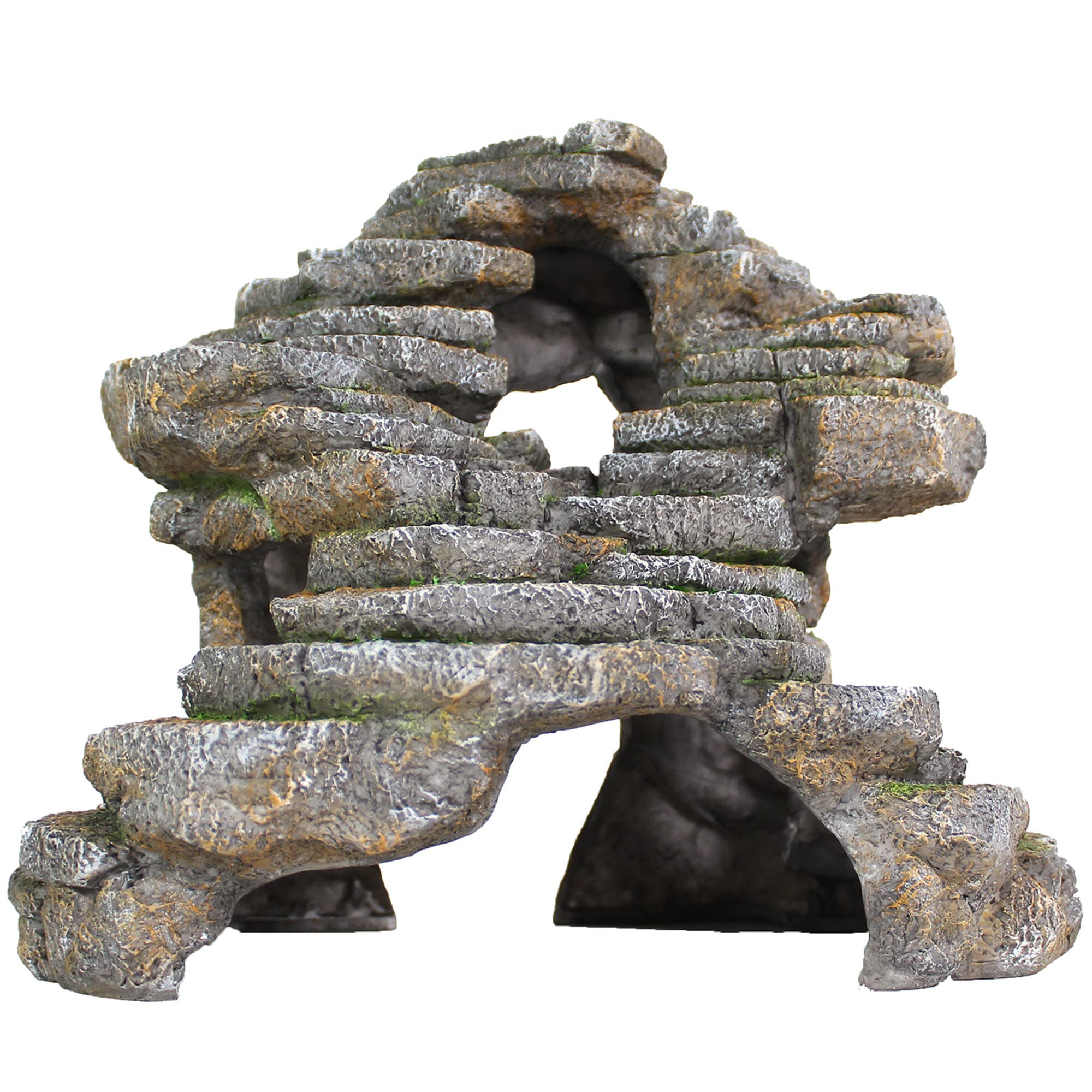 Reptology presents the Shale Scape Extra-Large Step Ledge & Cave by PENN-PLAX.Highlighting a rough, picturesque display, this Shale Scape is a must havefor pet owners looking to add a beautiful and functional piece to their aquarium or terrarium.Itll blend seamlessly with any environment, aquatic or dry.This piece is perfect for larger reptiles, newts, salamanders,crayfish, axolotls, snakes, territorial fish, and more!Great for Climbing and Basking:This Shale Scape is not only decorative, but is also purposeful!If your pet reptile or amphibian loves to climb, this piece will be their next mountain to conquer,as they rest peacefully on the top basking platform, regulating their body temperature as they see fit.Natural Hiding Spots:With 5 entrance and exit holes, the Reptology Shale Scape Step Ledge & Cave Hideoutoffers several ways to climb, slither, and swim around!In addition to reptiles and amphibians, this piece provides a great swim throughor hiding spot for axolotls, fish, and crustaceans, such as crayfish and shrimp.Most small and medium sized fish can pass through, allowing them to swim in and around it,which greatly helps reduce boredom and stress.Made of Safe and Durable Resin:Our Shale Scapes are inspected with your pets safety in mind,and are safe for freshwater and saltwater aquariums.The resin has a sturdy base: you dont need to worry about it floating around once you place it underwater.There may be rough or sharp surfaces on this product.Those assist reptiles with removing excess skin during their molting process.If you feel it is too sharp, you can easily smooth the area with a bit of sandpaper or a file.Measurements:Overall = 11.5 (W) x 9.5 (D) x 10.25 (H)Bottom Middle Hole = 6.5 x 2.75 Top Middle Hole = 2 x 3.5 Left Hole = 2 x 2 Right Hole = 2 x 3.75 Back Hole = 6.25 x 4.25 Shop PENN-PLAX for All Your Pets Needs:PENN-PLAX is a manufacturer and distributor of top quality pet supplies,who specialize in creating excellent pet products for animals, both great and small.