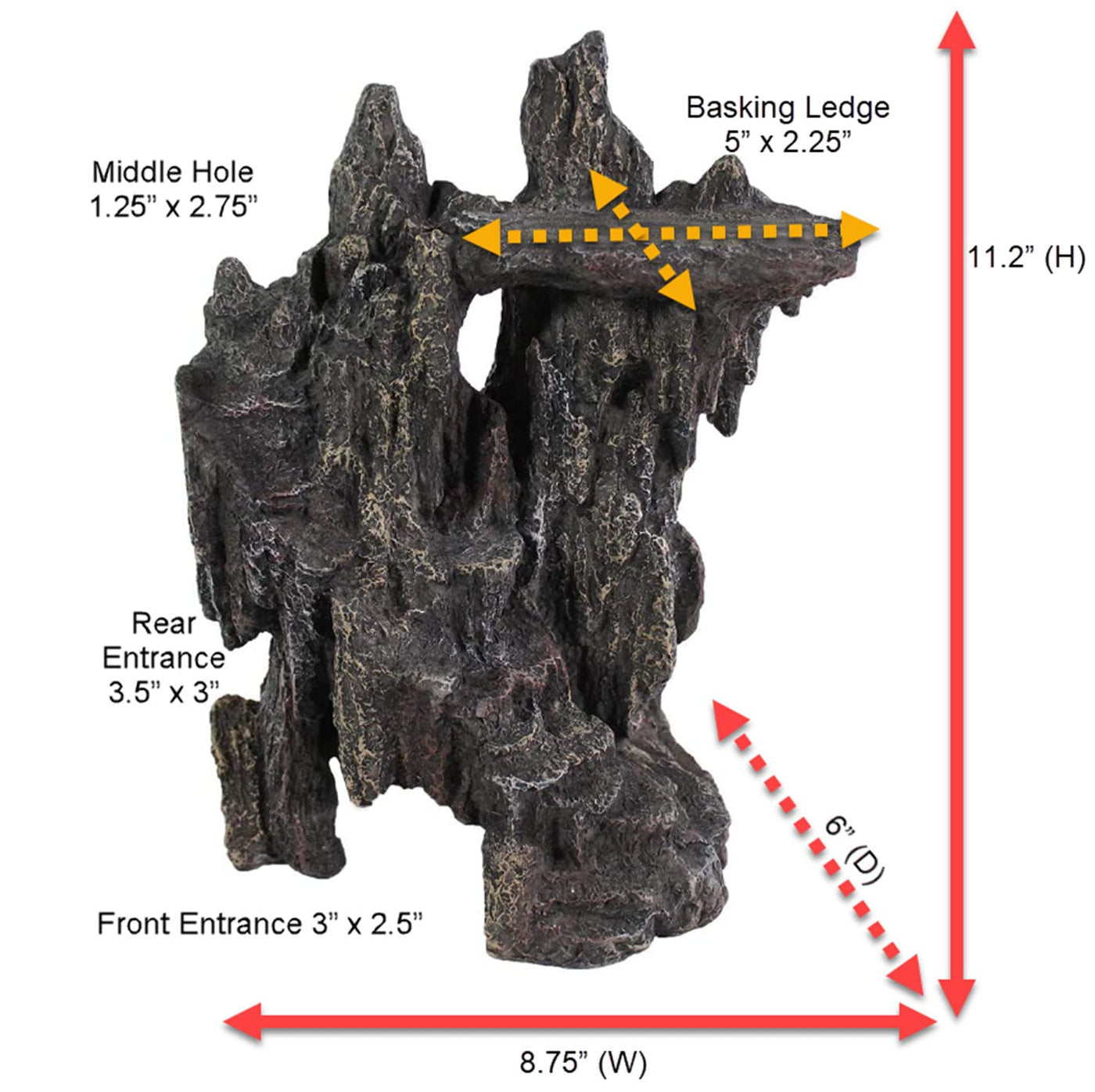 Reptology presents the Shale Scape Cavernous Cliff by PENN-PLAX.Unbound by a picturesque and marvelous atmosphere,the Shale-Scape Cavernous Cliff is a must have for pet ownerslooking to add a beautiful and functional piece to their aquarium or terrarium.Recreate an adventurous scene within your pets habitat or tank.Great for Climbing and Basking:This Shale Scape is not only decorative, but is also purposeful!If your pet reptile or amphibian loves to climb, this piece will be their next mountain to conquer,as they rest peacefully on the top basking ledge, regulating their body temperature.Or for those who are more quite, shy, and reserved,theres a hidden cavern on the bottom, with a front and rear entrance / exit.Perfect for Frogs, Geckos, Newts, Salamanders, and Snakes,along with other small lizards and reptiles.Works Well in Any Environment:In addition to reptiles and amphibians, this Shale Scape provides a great swim through or hiding spotfor axolotls, fish, and crustaceans, such as crayfish and shrimp.Most small and medium sized fish can pass through,allowing them to swim in and around it,which greatly helps reduce boredom and stress.Made of Safe and Durable Resin:Our Shale Scapes are inspected with your pets safety in mind,and are safe for freshwater and saltwater aquariums.The resin has a sturdy base: you dont need to worry about it floating around once you place it underwater.Measurements:Overall = 8.75 (W) x 6 (D) x 11.2 (H)Basking Ledge = 5 x 2.25 Front Entrance / Exit = 3 x 2.5 Rear Entrance / Exit = 3.5 x 3 Middle Hole = 1.25 x 2.75 Shop PENN-PLAX for All Your Pets Needs:PENN-PLAX is a manufacturer and distributor of top quality pet supplies,who specialize in creating excellent pet products for animals, both great and small.