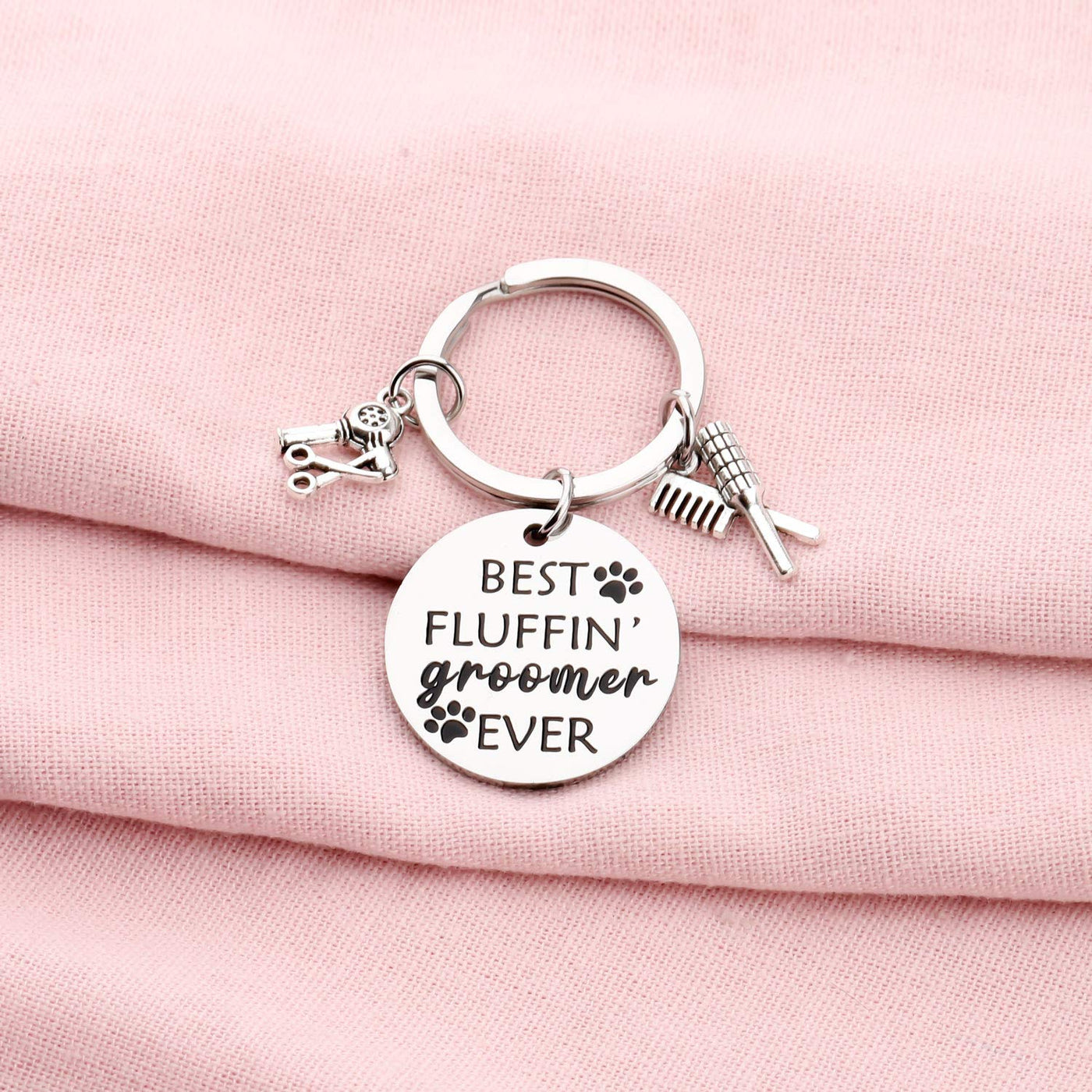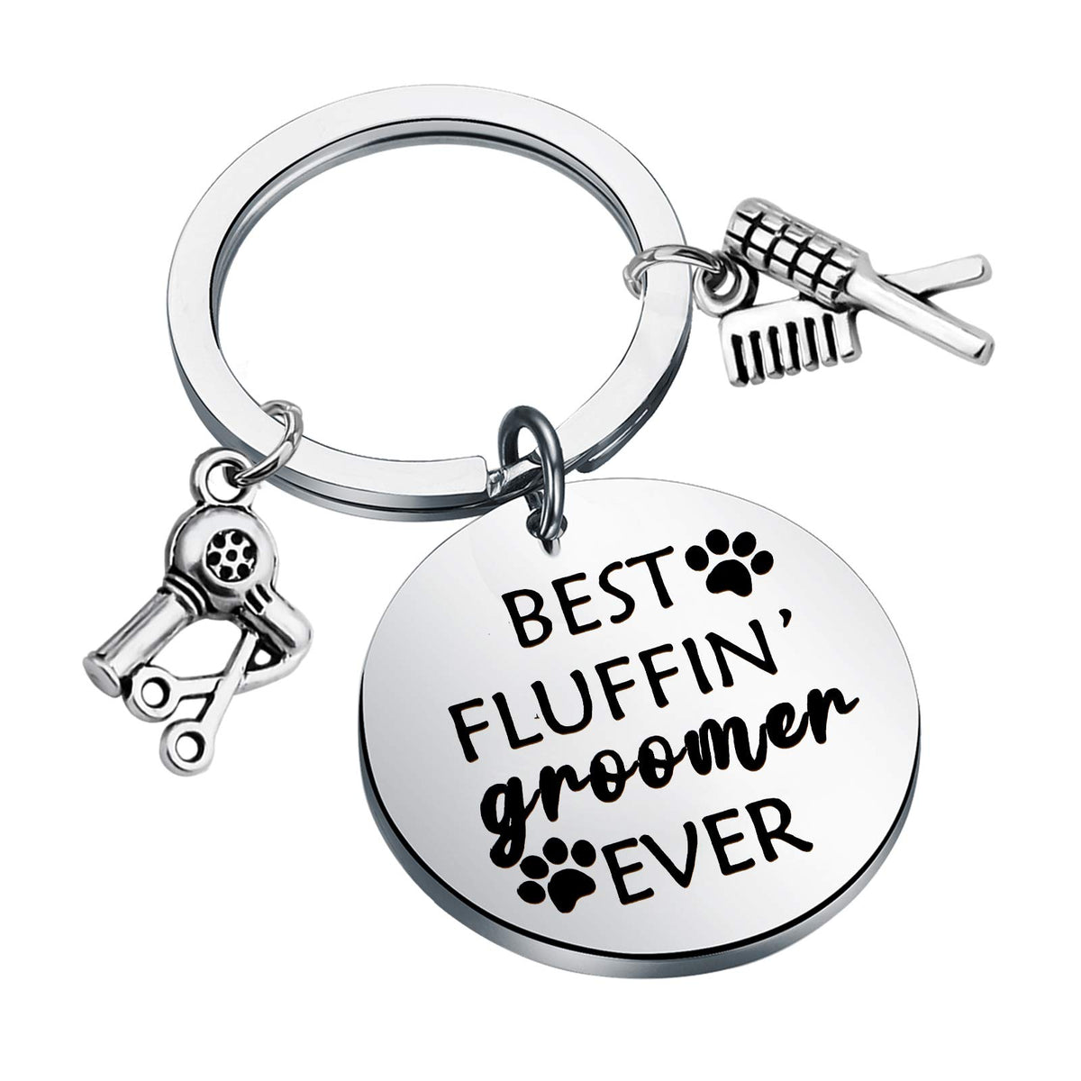 ?Dog Groomer Jewelry?This pet groomer key chain with Hair dryer comb charm was engraved the words”Best Fluffin' Groomer Ever”,a inspired grooming gift for dog groomers. | ?Grooming Gift for Men Women?A gift that honors the hard working, dog washing, claw clipping, fur brushing, blow drying, ear cleaning groomer.It is a perfect gift for dog groomer,pet groomer,dog hairdresser and dog lovers.Perfect for any occasion. | ?Material&Size?Made of stainless steel,it is lead free and nickel free hypo allergenic;Bright,shiny,also very durable.The diameter of this keychain is about:1.18inch. | ?PENQI jewelry packed in elegant jewelry pouches,and ready for giving.This will be a special gift for the recipient. | ?Satisfaction Guarantee?PENQI pay attention to the shopping experience of each customer, will provide the highest level of service and 100% shopping experience for each customer, if you have any questions about the purchased products, please feel free to contact us.