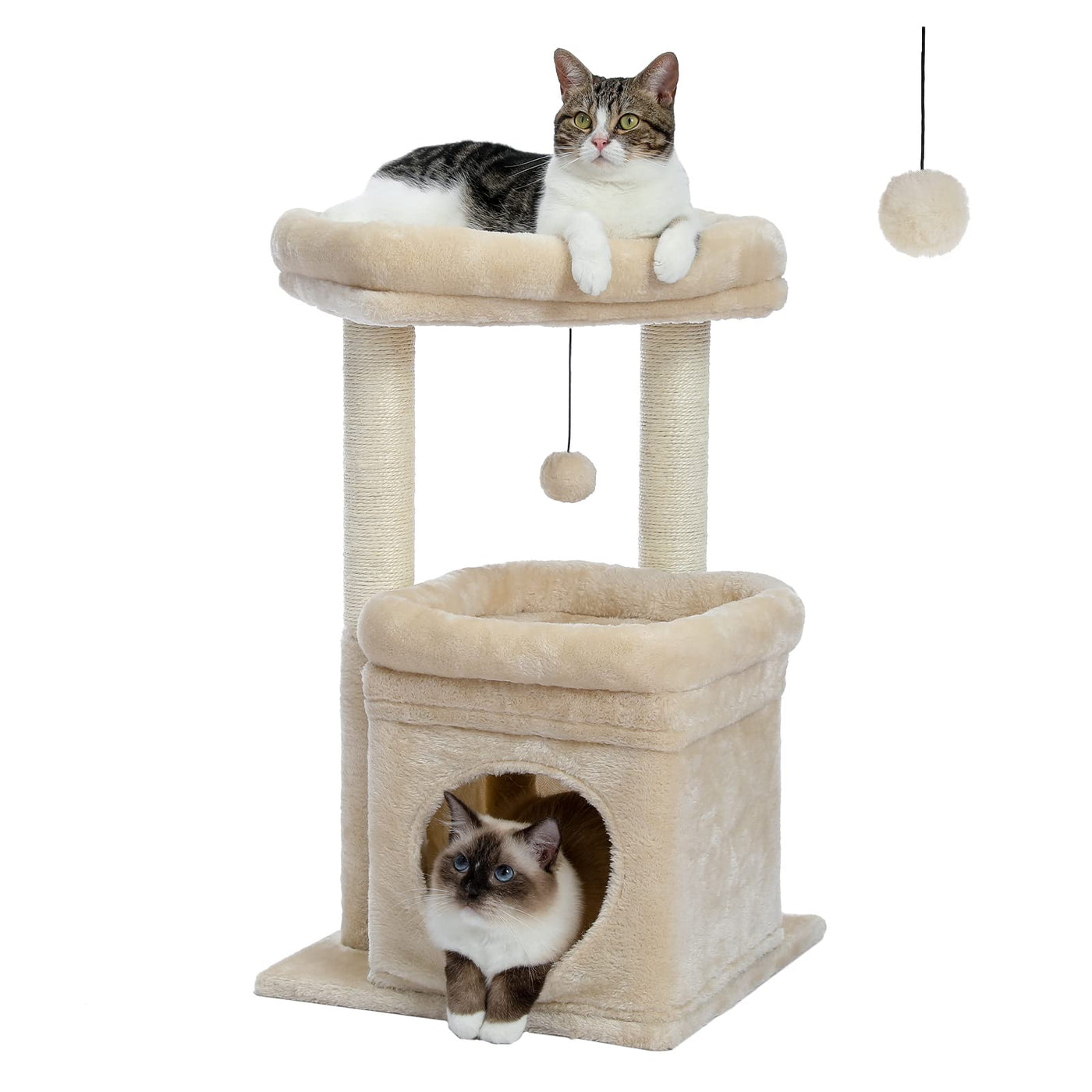 Pequlti Cat Tree Cat Tower For Indoor Cats With Private Cozy Cat Condo, Natural Sisal Scratching Posts And Plush Pom-Pom For Small Cats,Beige