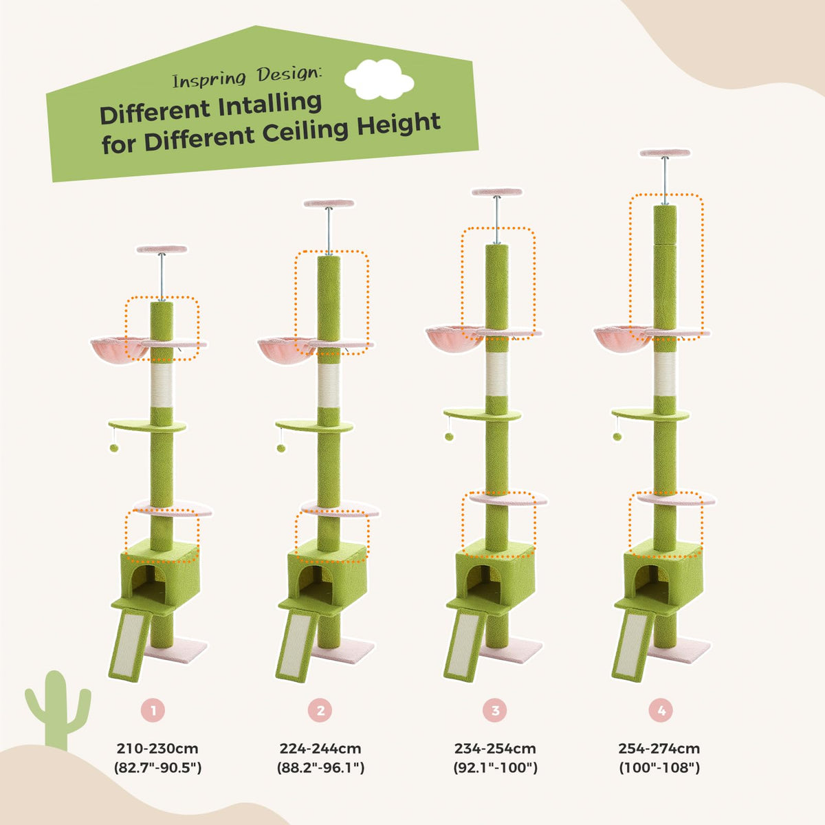 Pequlti Cat Tree Floor To Ceiling, Green Cat Tower, Adjustable Height (83''-108'') 5 Tiers Tall Climbing Tree For Indoor Cats Wi