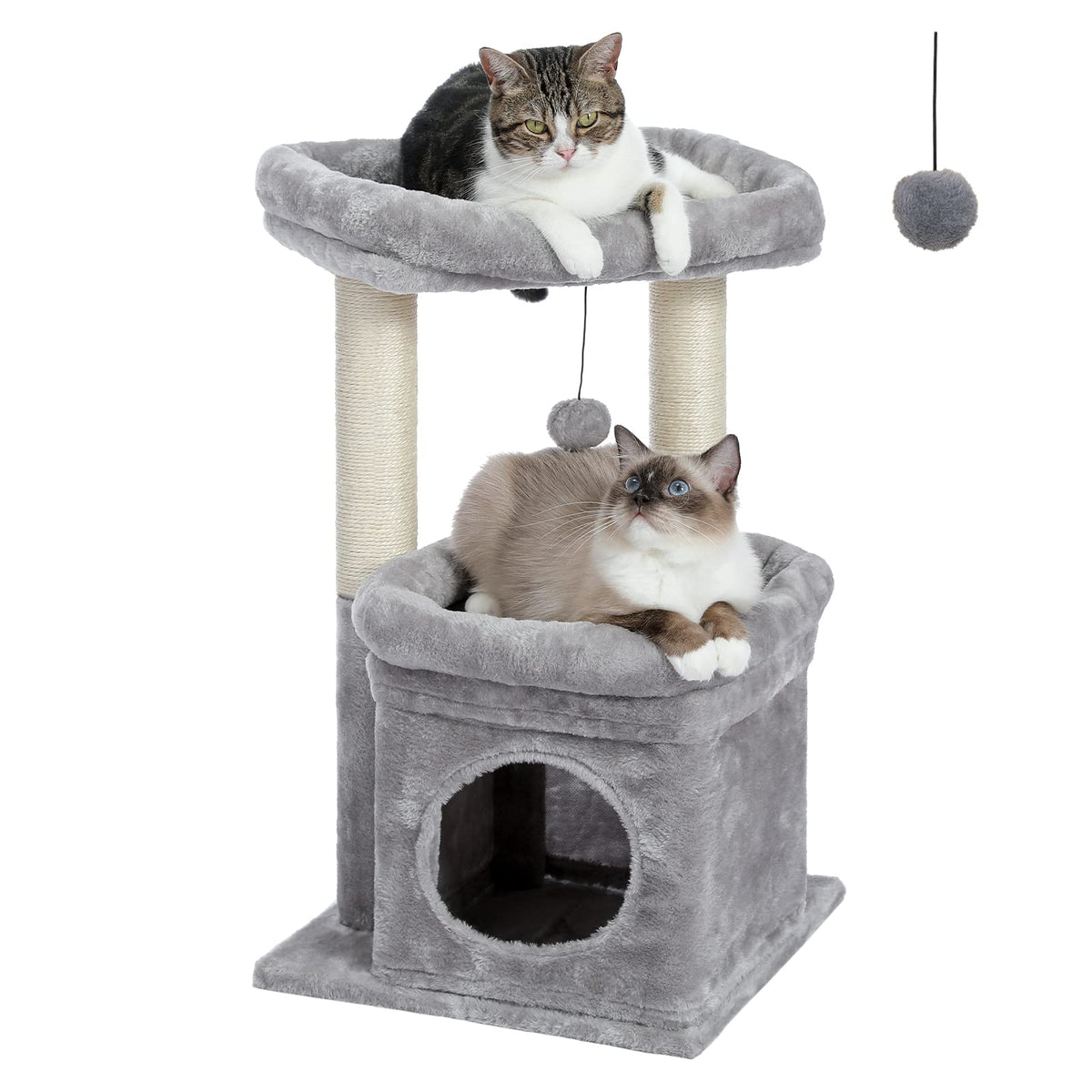 SUPERIOR QUALITY: composed by high quality cARB-certified Board and plush fabric the condo and perches are very soft and comfortable your furry family members will love the plush touch and enjoy exploring and sniffing around its new home Reinforced scratching posts are covered by natural sisal rope-one kind of healthy material which your cats will love because it feels a lot like scratching on tree bark cOZY AND WIDENED PERcH: 2 nicely cushioned and extra-large cat perch(213*157) with raised edge offers prime relaxing spot for your fur babies to lie down or sit on to look out the window The top perch is designed big enough to hold 2 kittens at the same time so that these 3 good friends can enjoy a nice sleeping or playtime together MORE FUN AND cOMFORT: A spacious and soft condo allows your cats to have a sweet dream after meal or heshe can choose the plush perch to have a short nap meanwhile enjoy the sunshine or outside scenery 3 straight scratching posts fully wrapped by sisal ropes provide plenty and healthy room to let your cats to sharpen their nails a feline favorite While the dangling ball is replaceable and will bring your cats extra fun SAFE AND STABLE: Reinforced base plate and well-balanced design make sure your cats can easily and safely leap on or off this small but sturdy cat tree EASY TO ASSEMBLE AND NIcE LOOKINg: Its attractive look will match with any room in your house like a piece of nice pet furniture rather than a jungle gym All the necessary tools are included just following the instruction step by step ItAs super easy to set it up The top cover is removable for easy care