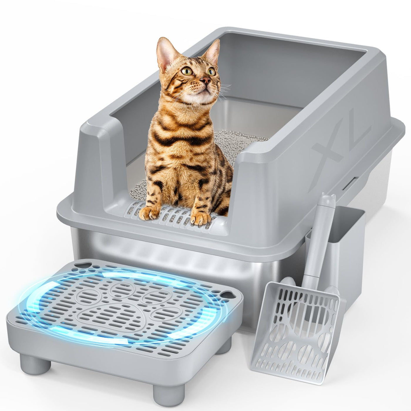 Perehome Stainless Steel Cat Litter Box With Lid, Extra Large Metal Litter Box For Big Cats Xl High-Sided Steel Litter Pan With