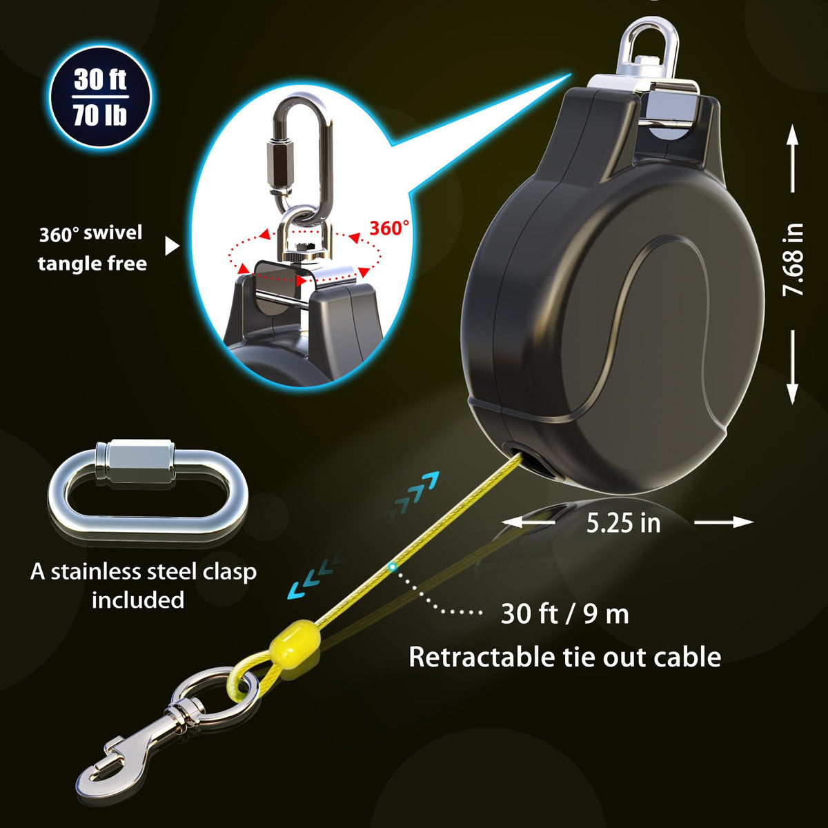 30Ft Retractable Dog Tie Out Cable And Retractable Dog Leash --- No Tangle Ties Out Reel Is Perfect For Home Or Travel. The No Tangle Tie-Out Reel Allows Your Pet To Freely Roam While Keeping The Excess Cable Neatly Stored In The Protective Casing. No More Unsightly Cables Meaning It Eliminates A Tripping Hazard. This Super-Durable Cord Features A Reflective Material, So Your Dog Can Easily Be Spotted At Any Time Of Day Or Night. This Tie Out Reel Is Great For Dog Owners With An Open Yard, As This Reel Provides Your Dog With The Freedom They Crave And The Safety You Seek As You Let Your Canine Companion Have A Good Time In The Great Outdoors. Help Your Pets Live The Vibrant Life. Our Products Are Specially Crafted With One Goal In Mind, Seeing Your Pet At Its Very Best. With A Variety Of Offerings Designed To Keep Animals Healthy, Happy And Energized, Vibrant Life Stands Out As The Brand That Truly Puts Your Pet First. Ideal For Dogs Up To 50 Lbs Reflective Material Provides Easier Visibility Of Your Dog At All Times Of The Day 10' Retractable Cable Easy To Transport
