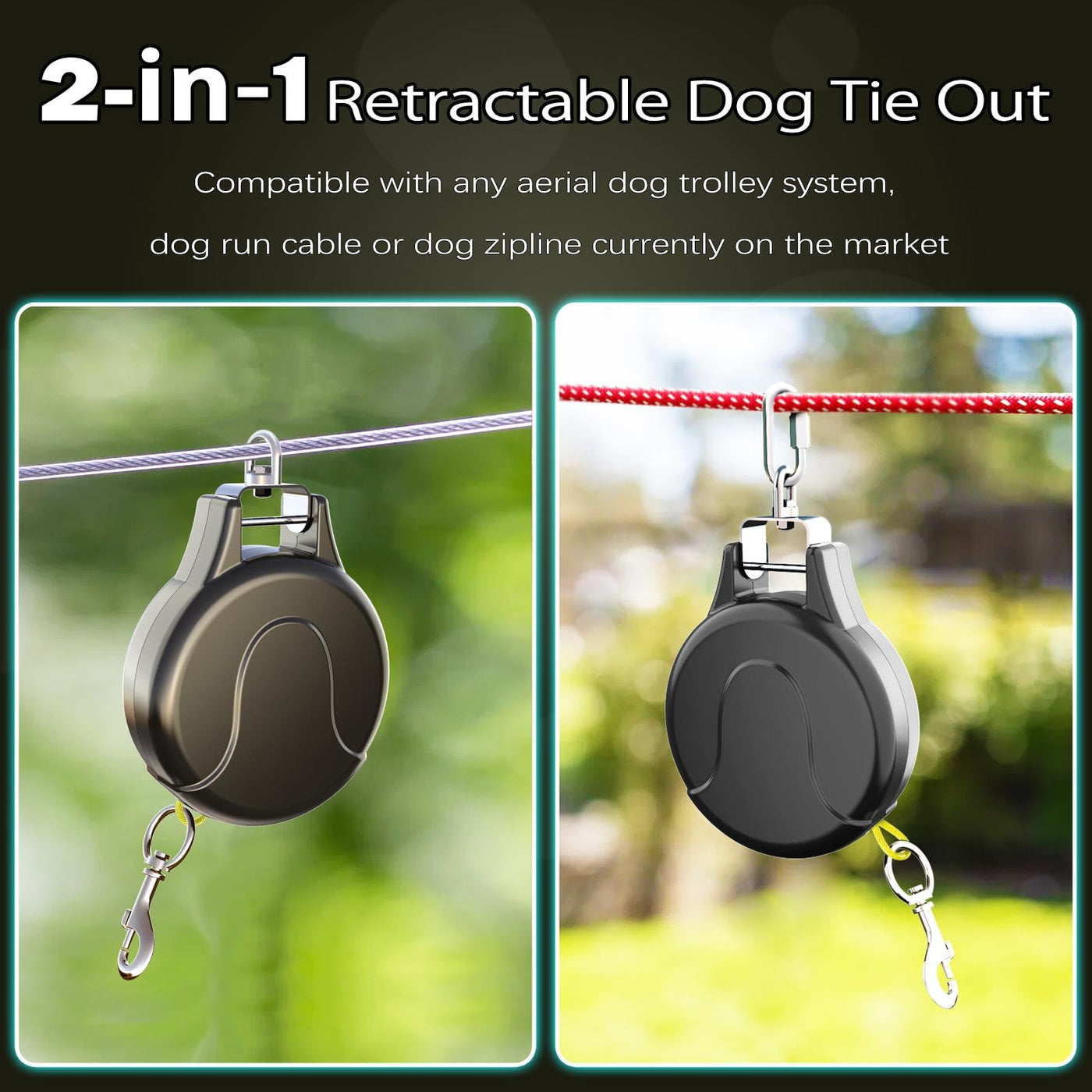 Pestairs 30Ft Dog Tie Out Cable And Retractable Dog Leash, 2-In-1 Lead For Zipline, Aerial Run Cable Trolley Or Anchor, No Tangl