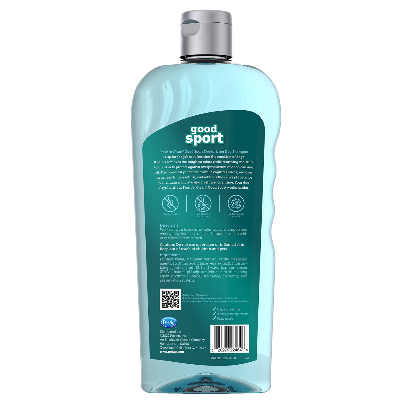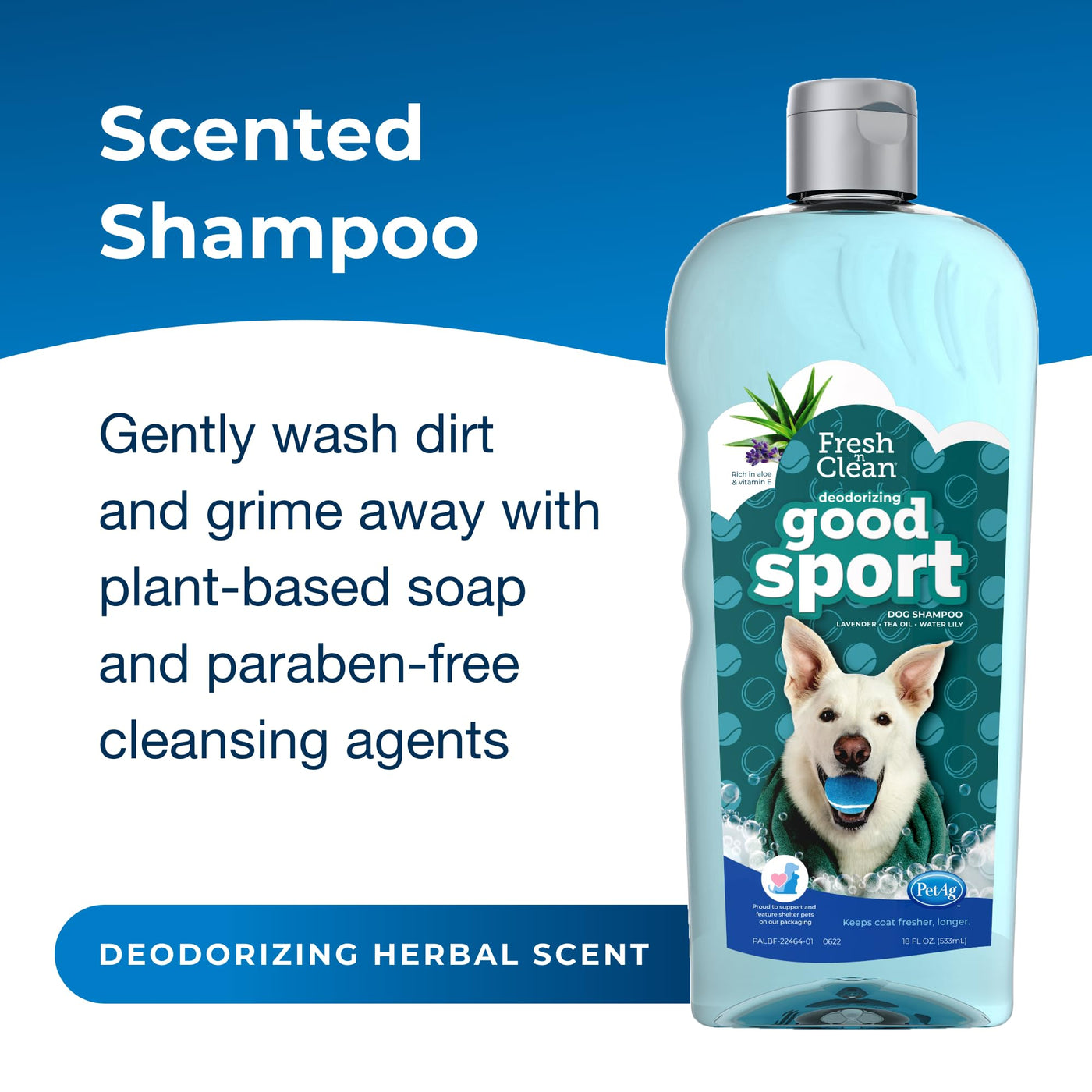 ODOR-CONTROL DOG SHAMPOO - Fresh ‘n Clean Good Sport Deodorizing Shampoo is up for the job of refreshing the smelliest of dogs. This powerful odor-control formula safely removes the toughest smells without irritating sensitive skin or damaging coats. | CLEANSES & MOISTURIZES - Formulated with natural, gentle cleansing agents, this soap-free shampoo thoroughly cleanses & rinses out easily. It’s pH balanced to maintain natural skin pH & includes aloe vera and vitamin E for a shiny, manageable coat. | LONG-LASTING FRAGRANCE - This shampoo features a long-lasting fragrance of lavender, woody tea oil, and water lily. It’s non-toxic, biodegradable, and made without parabens or common irritants. | HOW TO USE - Wet coat with lukewarm water, apply shampoo, and work gently into the base of coat. Saturate the skin with lush lather and rinse well. | ABOUT US - Pet-Ag offers solutions to enrich the lives of animals & their caregivers. From nutritional supplements to grooming products, all our products are science-backed, formulated with high-quality ingredients, and supported by quality control.
