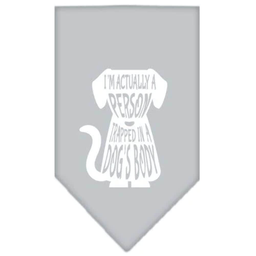 Q: What makes this bandana unique for my pet?A: The 'Trapped In A Dog's Body' screen-printed design showcases your pet's personality and adds a fun touch to their wardrobe, making it a great accessory for any occasion.