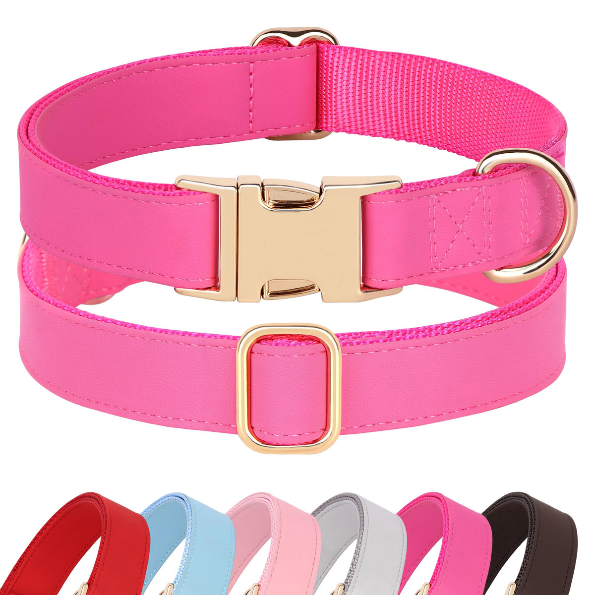 PET ARTIST Soft Solid Color Nylon&Leather Dog Collar Color:Blue,Brown,Grey,Red,Pink,Rose 3 Adjustable Sizes for Choose: S:Neck 9-14''(22-35cm),Width 3/4''(2.0cm) M:Neck 13-19''(32-48cm),Width 1.0''(2.5cm) L:Neck 16-27''(40-67cm),Width 1.0''(2.5cm) *Make sure to measure your dog's neck size for 2 fingers room before purchasing. *If any of the measurements are between two sizes or it's a growing puppy, PLEASE CHOOSE LARGER SIZE. Ideal for Small/Medium/Large Breeds like Bichon Frise,Chihuahua,French Bulldog, German Shepherd,Doberman Pinscher,Golden Retriever,Labrador,Alaskan Malamute,Labrador Retriever,Pit bulls etc. Features: 1.Our dog collar is made of durable pu leather and fine nylon webbing,solid and durable,suitable for different scenarios.Whether walking,hiking, or training, it will have a good effect 2.We have many colors for your choice,Blue Red Brown Grey Pink Rose, You don't need to worry about choosing a color about a boy or a girl dog collar, each color can show uniqueness of your dog.Whether you take your dog walking, hiking, or attending weddings, pet parties, it surely will let your dog be a focus. 3.Indestructible heavy duty metal hardware are make it more hardwearing, which is more durable than plastic buckle.In most emergency situations, you can quickly and easily remove your puppy collar with clip closure. 4.The collar does not stretch itself, please make sure leave ONLY 2 fingers between collar and dog neck. A properly fitting collar and harness won't leave any room for your dog to chew.Measure your dog's NECK carefully and refer to SIZE CHART before order to make sure PET ARTIST leather dog collar will fit well. 5.Recommended to use with PET ARTIST dog leash,dog harness to completed your pup's outdoor walking accessories.