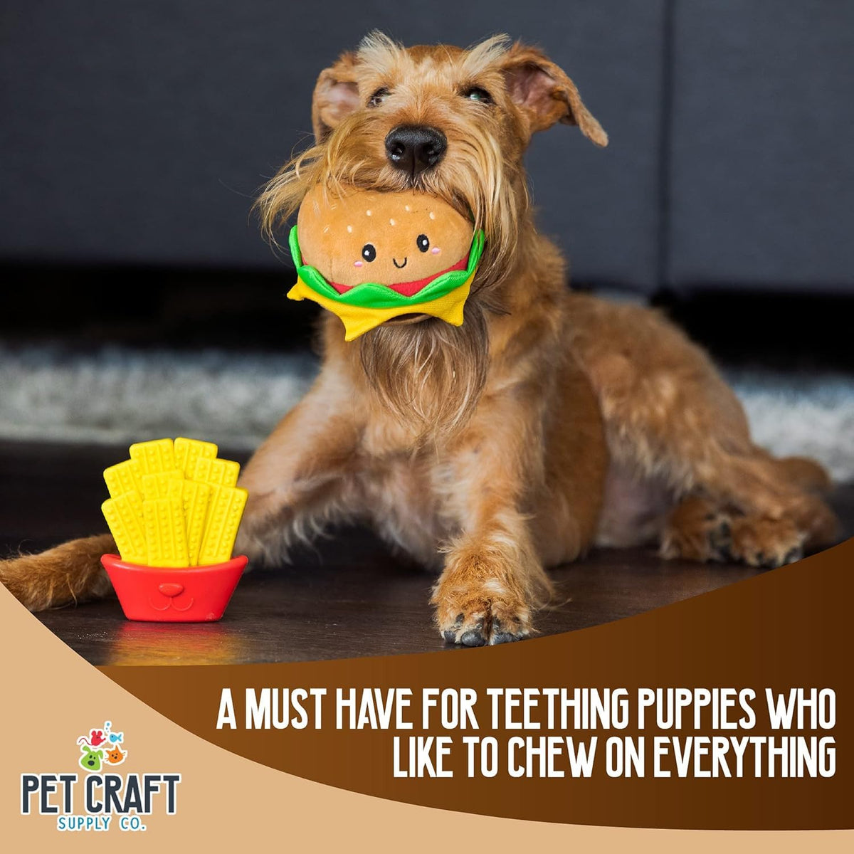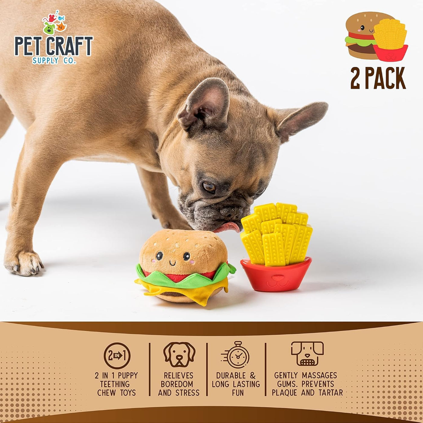 Q: What are the benefits of using the Pet Craft Supply Chewburger & Fries for my puppy?A: The Pet Craft Supply Chewburger & Fries toys promote dental health by cleaning teeth and massaging gums with their textured nylon material. They also help prevent destructive chewing and relieve boredom, making them ideal for teething puppies.