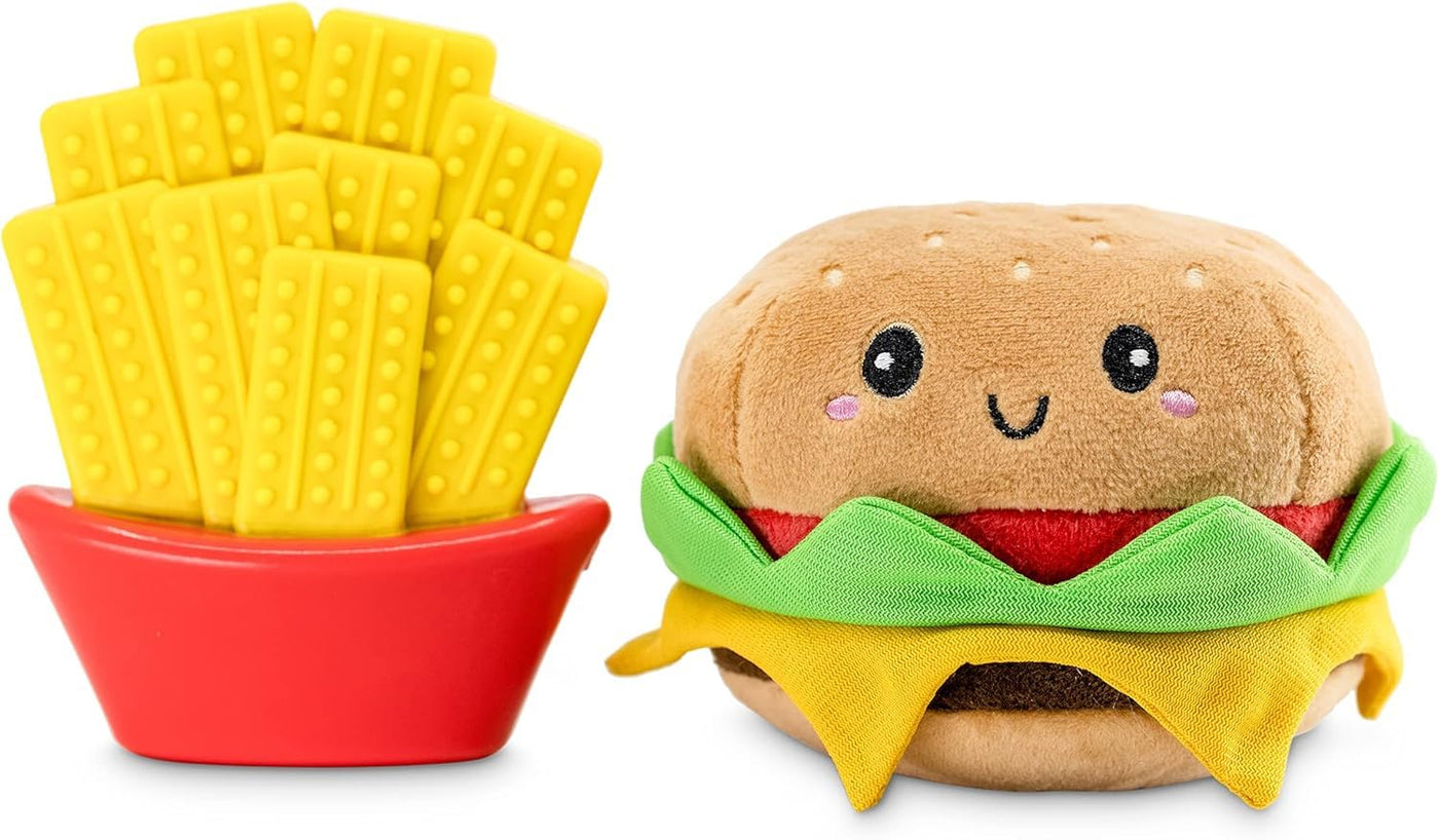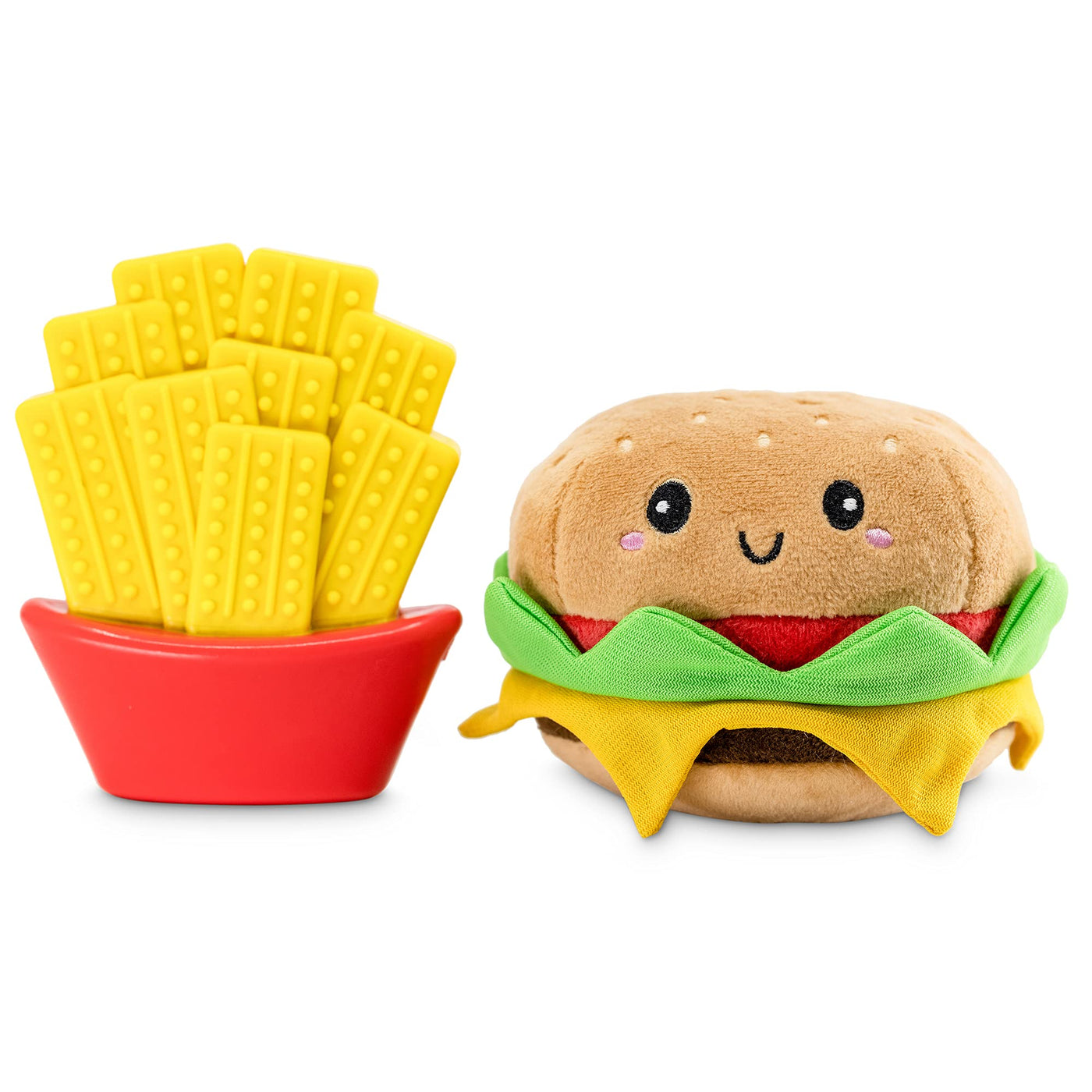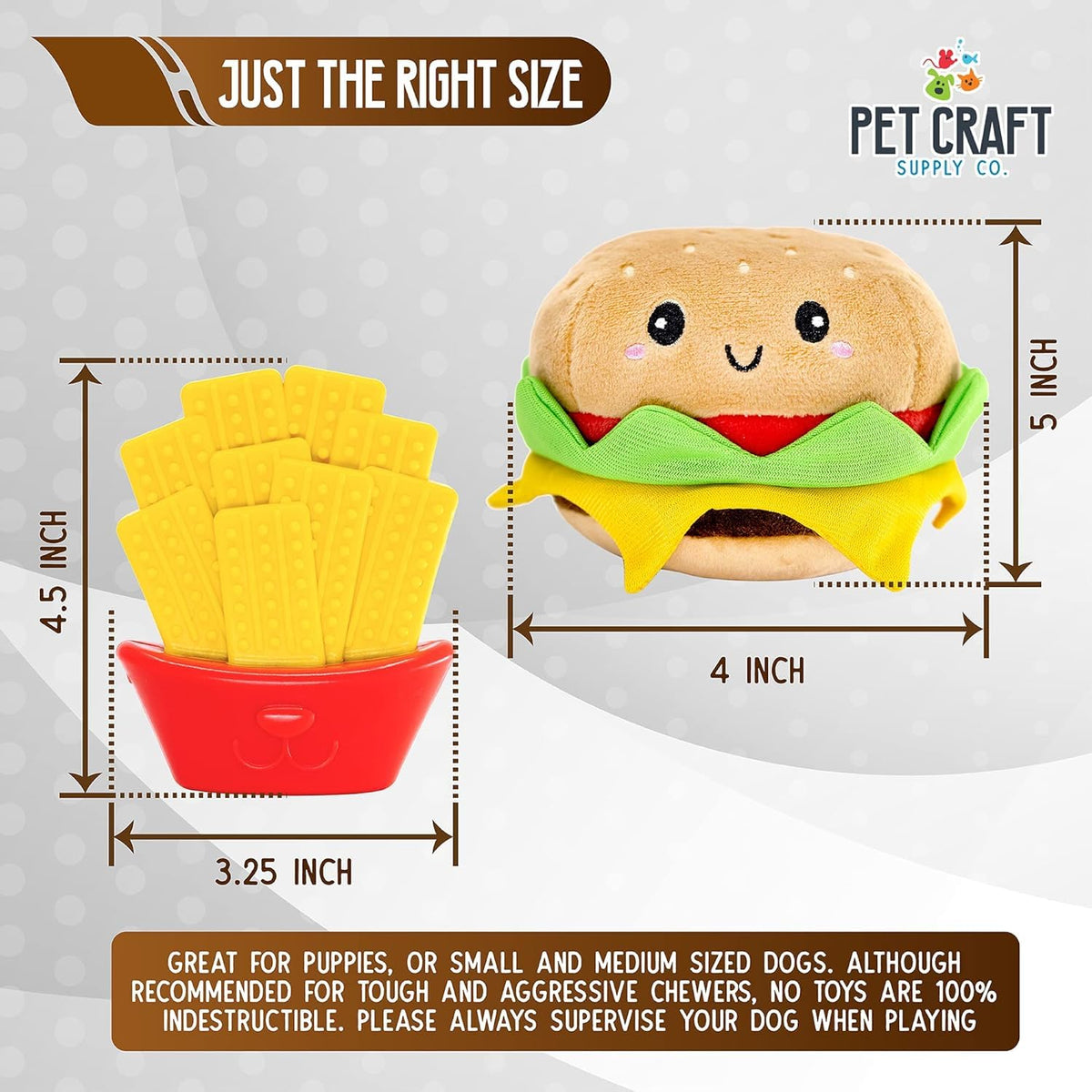 Q: What sizes are the Chewburger & Fries toys suitable for?A: These toys are perfect for puppies and small to medium-sized dogs. The fries nylon bone measures 4.5 inches, and the plush burger toy is 5 inches, making them just the right size for teething pups.