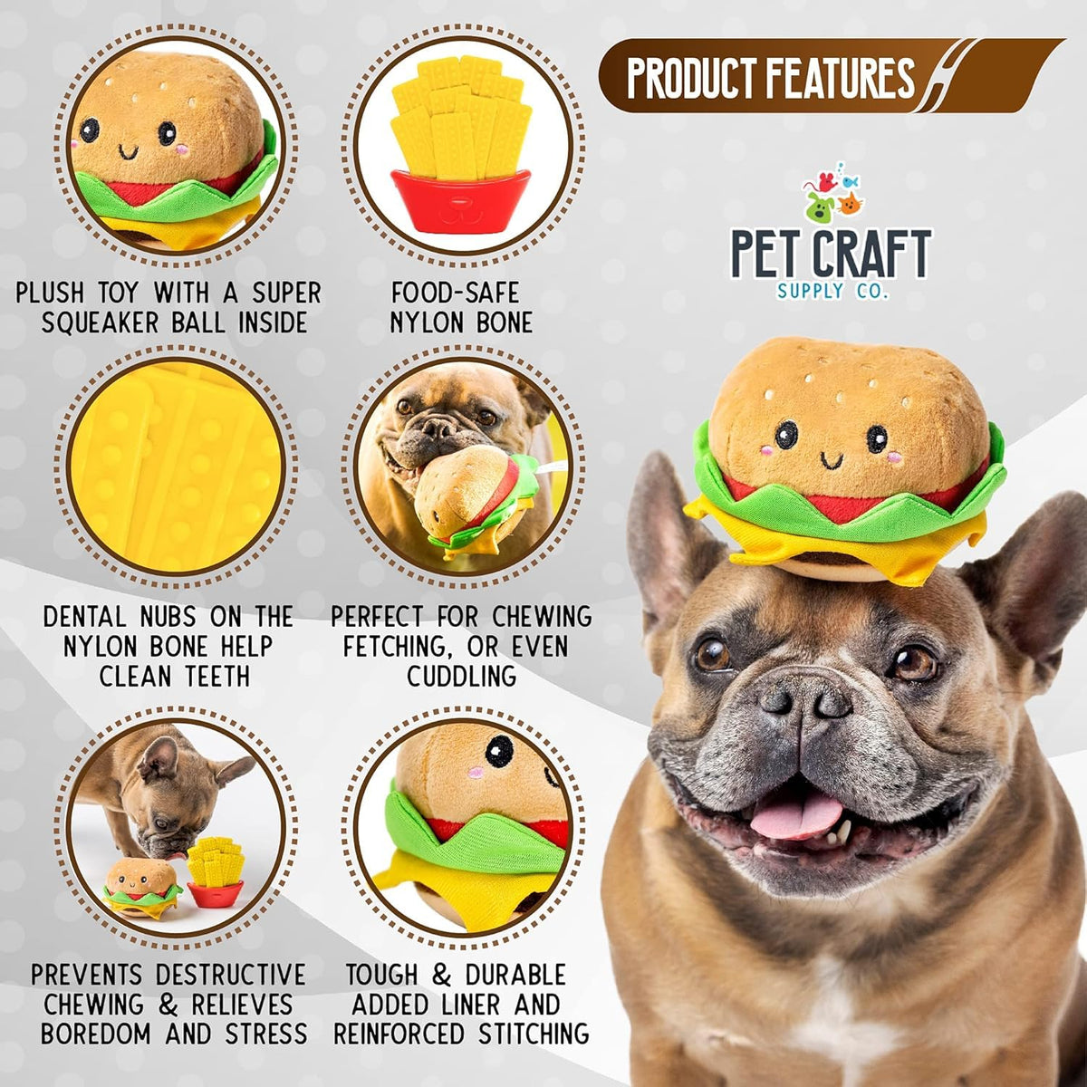 Q: How should I clean the Pet Craft Supply Chewburger & Fries toys?A: To clean the toys, wipe them down with a damp cloth and mild detergent. Ensure they are thoroughly dried before giving them back to your pet. The plush material should not be submerged in water to maintain its shape.