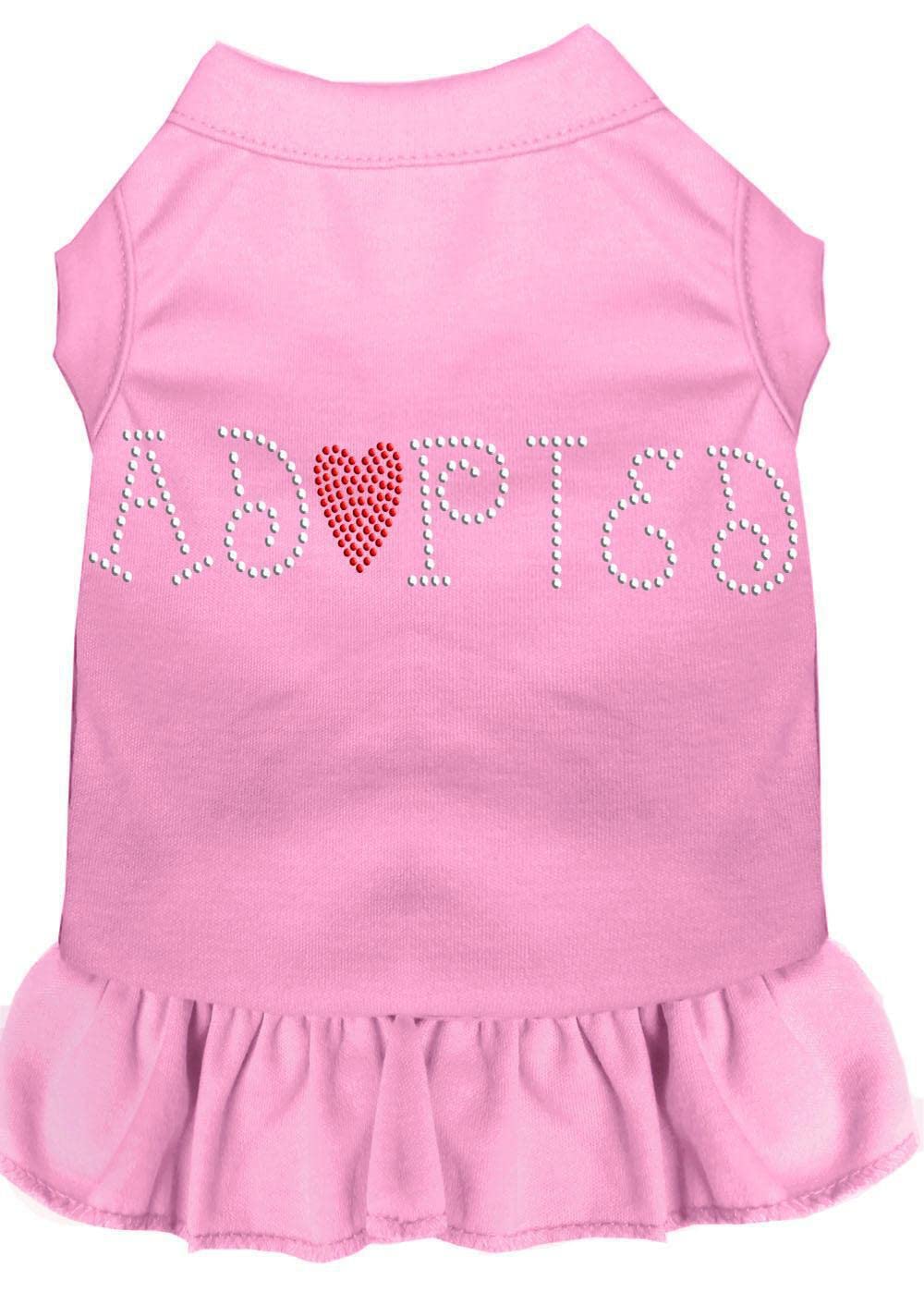 Q: What makes this dress a good choice for my pet?A: This Pet Dog & Cat Dress is handcrafted in the USA, features a stylish rhinestone design that says 'Adopted', and is made from a soft, durable material perfect for everyday wear or special occasions.