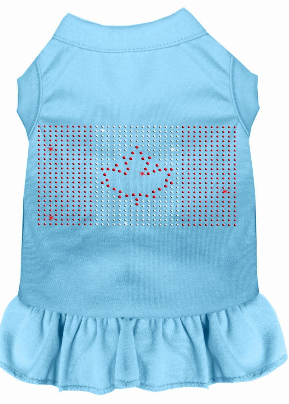 Q: What makes this dress unique compared to other pet apparel?A: This dress features a unique rhinestone design and a vibrant 'Canadian Flag' theme, making it a stylish choice for any girlie pet. Additionally, it is handcrafted in the USA, emphasizing quality craftsmanship.