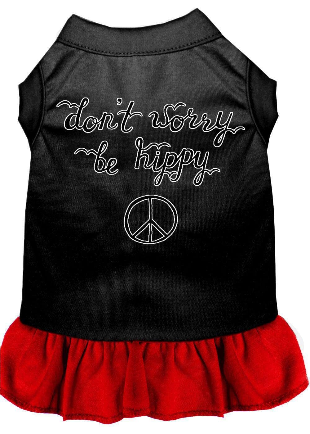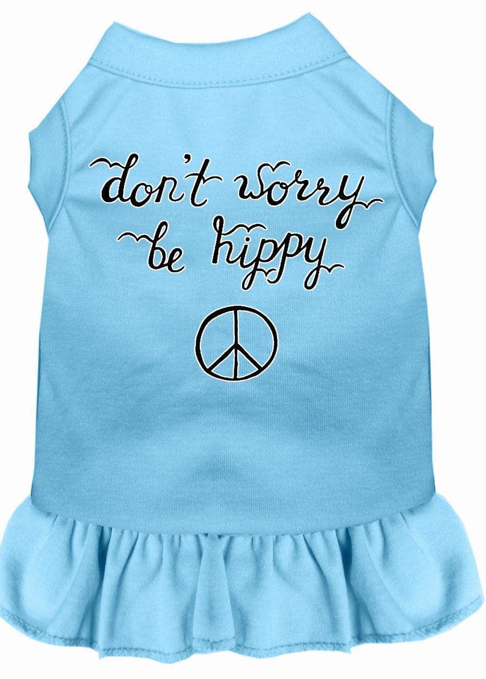 Q: What sizes are available for the 'Don't Worry, Be Hippy' dress?A: The 'Don't Worry, Be Hippy' dress is available in XX-Large, suitable for dogs weighing between 20-25 lbs. Be sure to consult the sizing chart for the best fit.