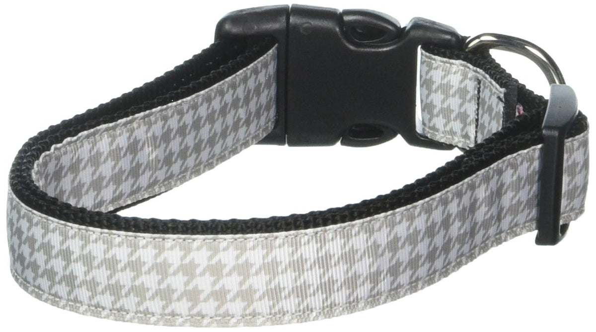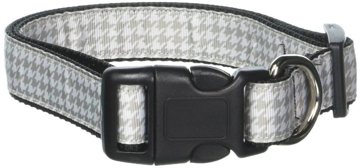 Q: What sizes are available for the Houndstooth Grey collar?A: The Houndstooth Grey collar is available in a Large size, suitable for larger dog breeds. Be sure to check the collar measurements to ensure a proper fit for your pet.