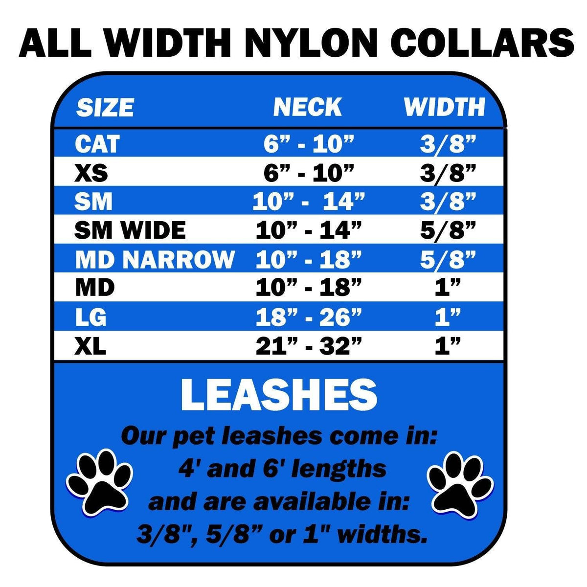 Q: What sizes are available for the Pet Dog & Cat Nylon Collar or Leash?A: The Pet Dog & Cat Nylon Collar is available in a small size, and our pet leashes come in 4' and 6' lengths with varying widths of 3/8", 5/8", or 1".