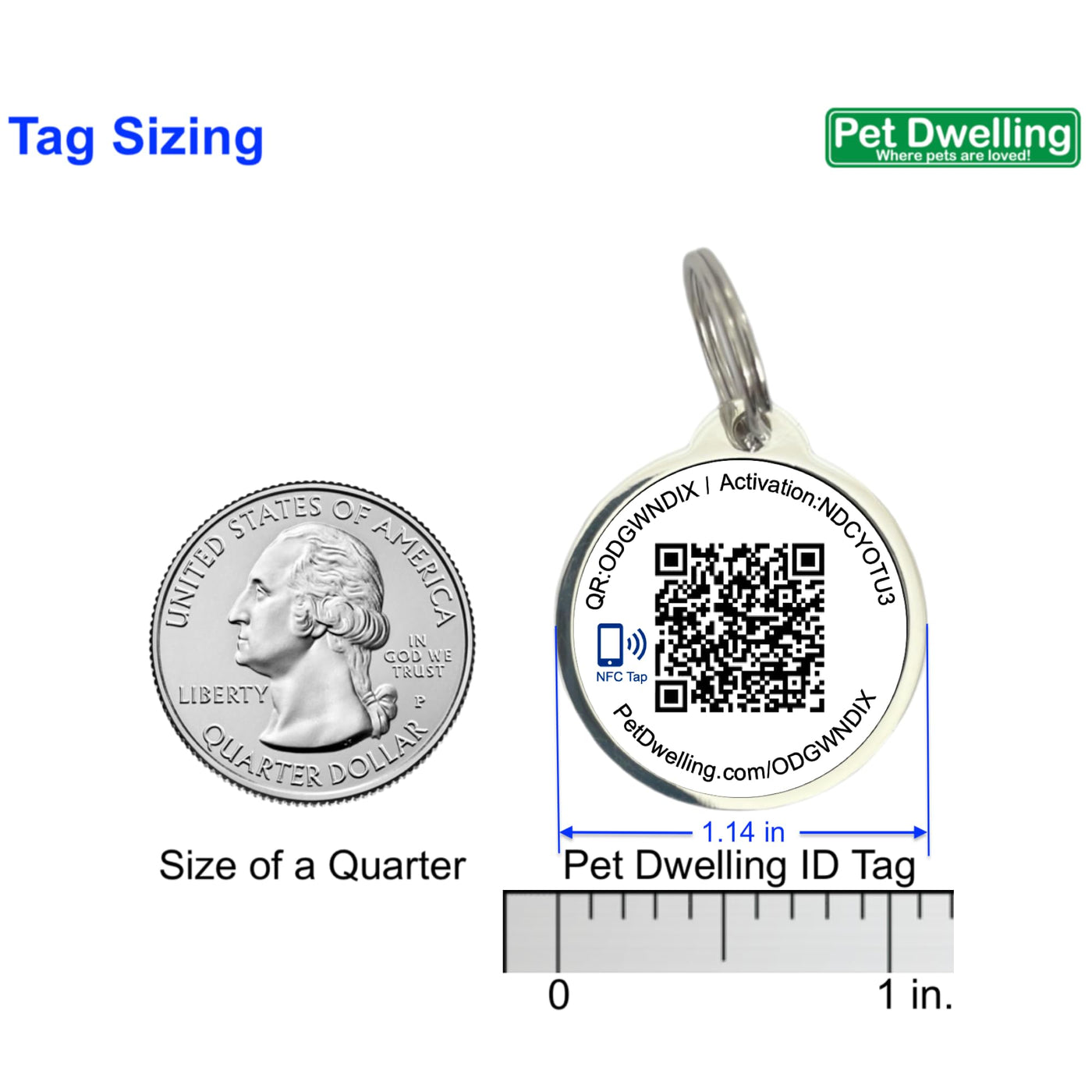 Q: How does the NFC-QR Code Pet ID Tag work?A: The Pet Dwelling Premium NFC-QR Code Pet ID Tag features an embedded NFC chip and a scannable QR code. When someone scans the tag using their smartphone or taps it with an NFC-enabled device, they gain access to your pet's online profile, which can include important details like your pet's name, medical information, and your contact details.