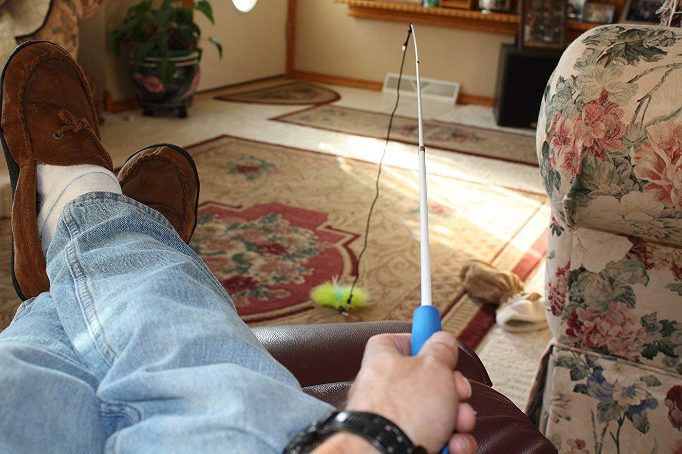 Pet Fit For Life - Retractable Feather Wand For Cats - Durable Interactive Cat Toy, Teaser Fishing Pole With Feather Lures - Fun Kitten Play Wand, 2 Feathers With String And Flying Fish Attachment