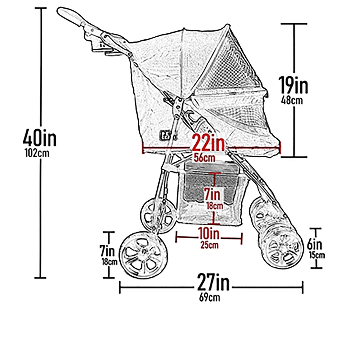 Q: What are the dimensions of the Pet Gear Happy Trails Lite Pet Stroller?A: The Pet Gear Happy Trails Lite Pet Stroller has overall dimensions of 22 inches in length, 11 inches in width, and 16 inches in height. The height to the handle is 37.5 inches, and the interior dimensions are 21.5 inches in length and 11 inches in width, with a height of 17 inches.